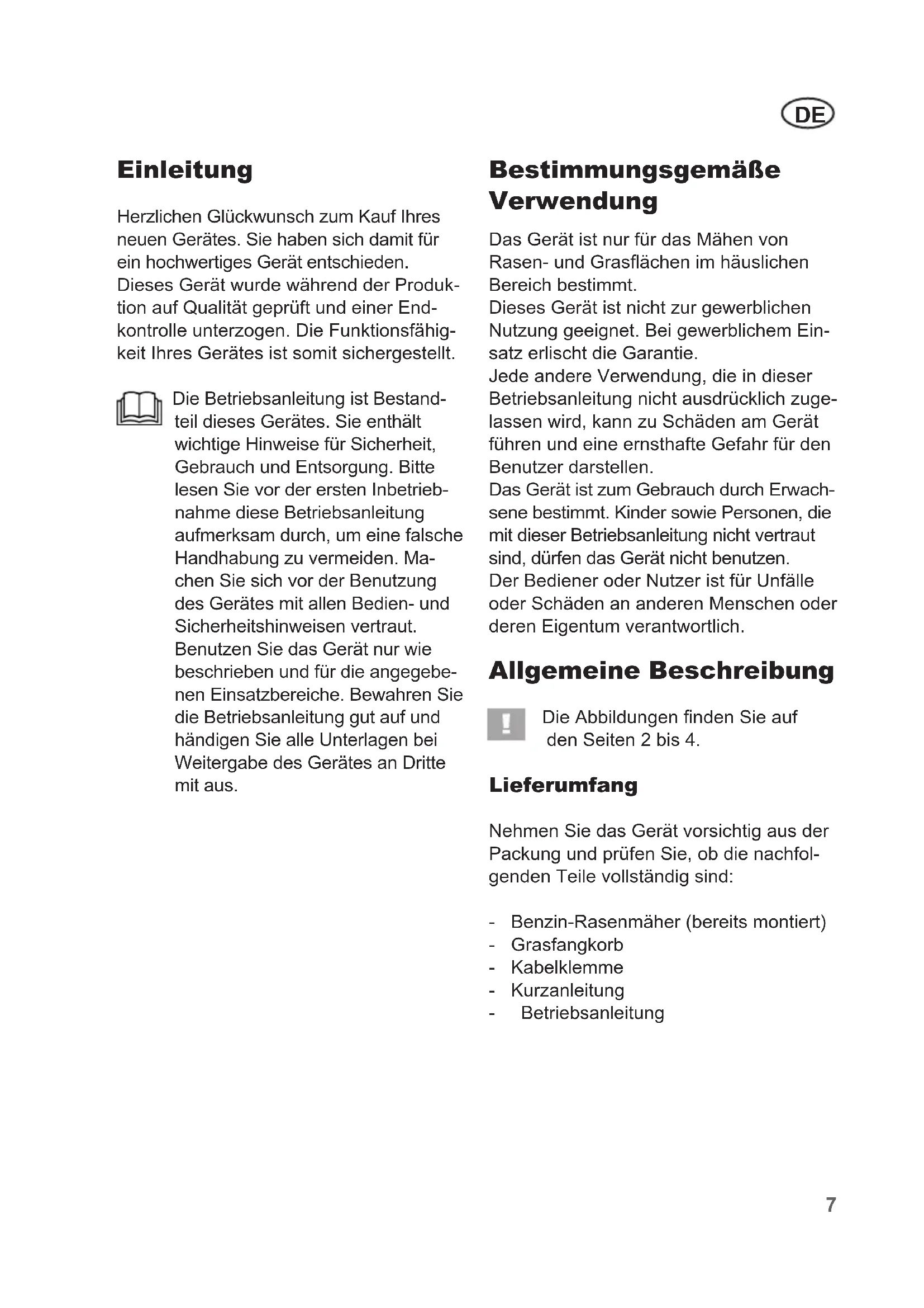 Einleitung HerzlichenGlückwunschzumKaufIhres neuenGerätes.Siehabensichdamitfür einhochwertigesGerätentschieden. DiesesGerätwurdewährendderProduk- tionaufQualitätgeprüftundeinerEnd- kontrolleunterzogen.DieFunktionsfähig- keitIhresGerätesistsomitsichergestellt. Die Betriebsanleitung ist Bestand- teildiesesGerätes.Sieenthält wichtigeHinweisefürSicherheit, GebrauchundEntsorgung.Bitte lesenSievordererstenInbetrieb- nahme diese Betriebsanleitung aufmerksamdurch,umeinefalsche Handhabungzuvermeiden.Ma- chenSiesichvorderBenutzung desGerätesmitallenBedien-und Sicherheitshinweisenvertraut. BenutzenSiedasGerätnurwie beschrieben und für die angegebe- nenEinsatzbereiche.BewahrenSie die Betriebsanleitung gut auf und händigenSiealleUnterlagenbei WeitergabedesGerätesanDritte mit aus. Bestimmungsgemäße Verwendung DasGerätistnurfürdasMähenvon Rasen-undGrasächenimhäuslichen Bereich bestimmt. DiesesGerätistnichtzurgewerblichen Nutzunggeeignet.BeigewerblichemEin- satzerlischtdieGarantie. JedeandereVerwendung,dieindieser Betriebsanleitungnichtausdrücklichzuge- lassenwird,kannzuSchädenamGerät führenundeineernsthafteGefahrfürden Benutzerdarstellen. DasGerätistzumGebrauchdurchErwach- senebestimmt.KindersowiePersonen,die mit dieser Betriebsanleitung nicht vertraut sind,dürfendasGerätnichtbenutzen. DerBedieneroderNutzeristfürUnfälle oderSchädenananderenMenschenoder derenEigentumverantwortlich. Allgemeine Beschreibung DieAbbildungenndenSieauf den Seiten 2 bis 4. Lieferumfang NehmenSiedasGerätvorsichtigausder PackungundprüfenSie,obdienachfol- gendenTeilevollständigsind: - Benzin-Rasenmäher(bereitsmontiert) - Grasfangkorb - Kabelklemme - Kurzanleitung - Betriebsanleitung8