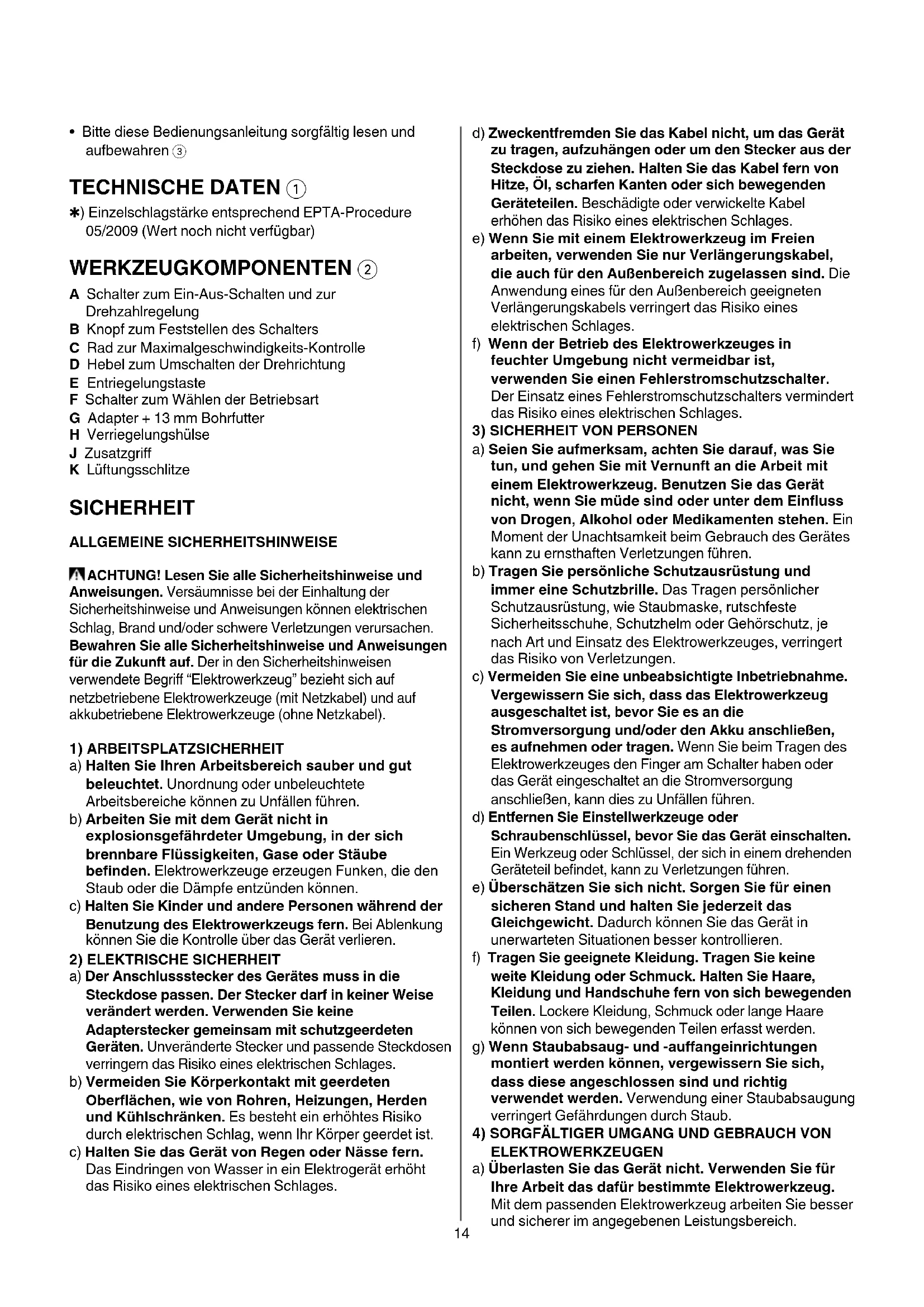 - Bitte diese Bedienungsanleitung sorgfältig lesen und aufbewahren 3 TECHNISCHE DATEN 1 ✱) Einzelschlagstärke entsprechend EPTA-Procedure 05/2009 (Wert noch nicht verfügbar) WERKZEUGKOMPONENTEN 2 A Schalter zum Ein-Aus-Schalten und zur Drehzahlregelung B Knopf zum Feststellen des Schalters C Rad zur Maximalgeschwindigkeits-Kontrolle D Hebel zum Umschalten der Drehrichtung E Entriegelungstaste F Schalter zum Wählen der Betriebsart G Adapter + 13 mm Bohrfutter H Verriegelungshülse J Zusatzgri K Lüftungsschlitze SICHERHEIT ALLGEMEINE SICHERHEITSHINWEISE ACHTUNG! Lesen Sie alle Sicherheitshinweise und Anweisungen. Versäumnisse bei der Einhaltung der Sicherheitshinweise und Anweisungen können elektrischen Schlag, Brand und/oder schwere Verletzungen verursachen. Bewahren Sie alle Sicherheitshinweise und Anweisungen für die Zukunft auf. Der in den Sicherheitshinweisen verwendete Begriff “Elektrowerkzeug” bezieht sich auf netzbetriebene Elektrowerkzeuge (mit Netzkabel) und auf akkubetriebene Elektrowerkzeuge (ohne Netzkabel).