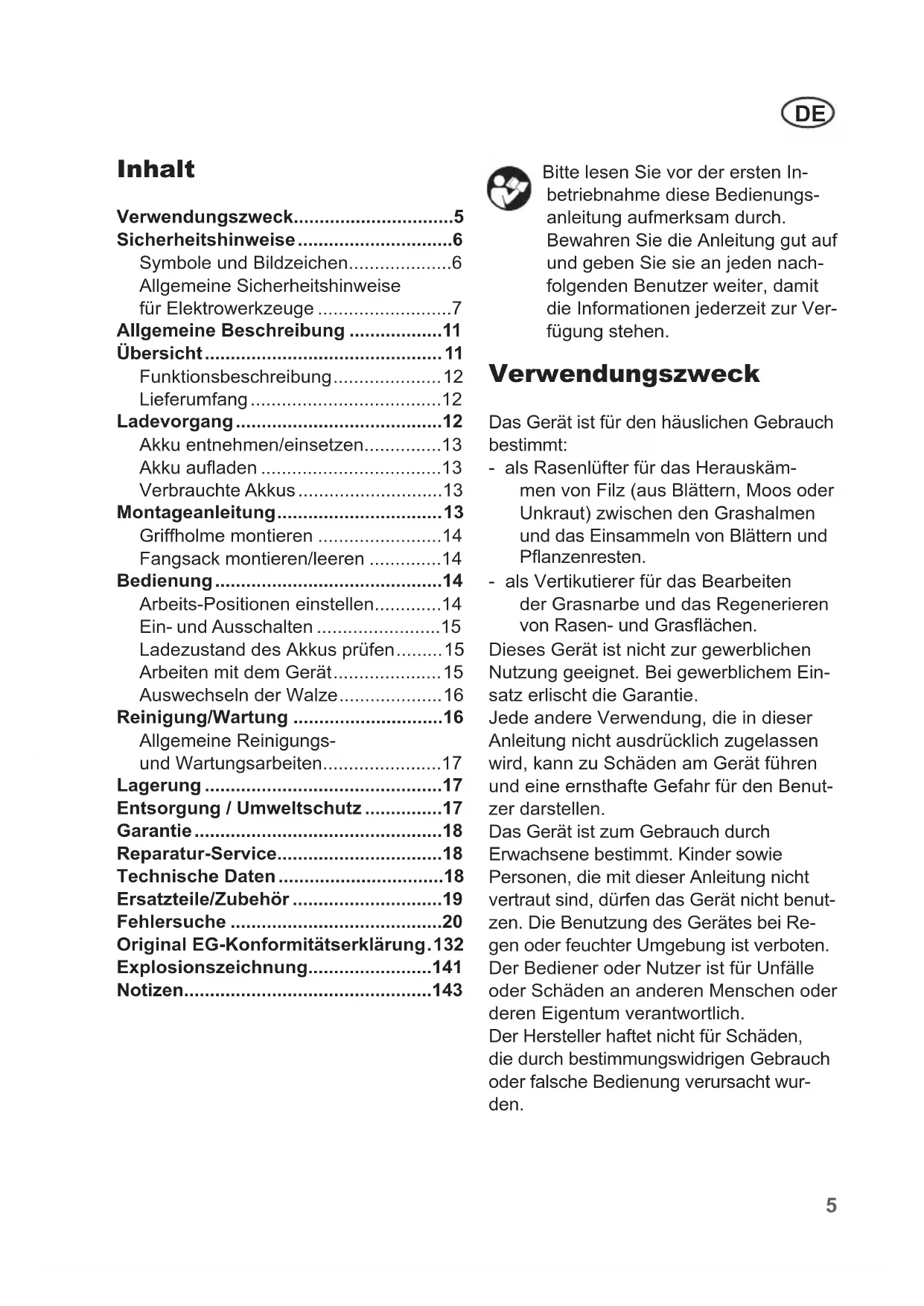 - Bitte lesen Sie vor der ersten In- betriebnahme diese Bedienungs- anleitung aufmerksam durch. Bewahren Sie die Anleitung gut auf und geben Sie sie an jeden nach- folgenden Benutzer weiter, damit die Informationen jederzeit zur Ver- fügung stehen. Verwendungszweck Das Gerät ist für den häuslichen Gebrauch bestimmt: - als Rasenlüfter für das Herauskäm- men von Filz (aus Blättern, Moos oder Unkraut) zwischen den Grashalmen und das Einsammeln von Blättern und Panzenresten. - als Vertikutierer für das Bearbeiten der Grasnarbe und das Regenerieren von Rasen- und Grasächen. Dieses Gerät ist nicht zur gewerblichen Nutzung geeignet. Bei gewerblichem Ein- satz erlischt die Garantie. Jede andere Verwendung, die in dieser Anleitung nicht ausdrücklich zugelassen wird, kann zu Schäden am Gerät führen und eine ernsthafte Gefahr für den Benut- zer darstellen. Das Gerät ist zum Gebrauch durch Erwachsene bestimmt. Kinder sowie Personen, die mit dieser Anleitung nicht vertraut sind, dürfen das Gerät nicht benut- zen. Die Benutzung des Gerätes bei Re- gen oder feuchter Umgebung ist verboten. Der Bediener oder Nutzer ist für Unfälle oder Schäden an anderen Menschen oder deren Eigentum verantwortlich. Der Hersteller haftet nicht für Schäden, die durch bestimmungswidrigen Gebrauch oder falsche Bedienung verursacht wur- den. Original EG-Konformitätserklärung . 132 Explosionszeichnung p. 141