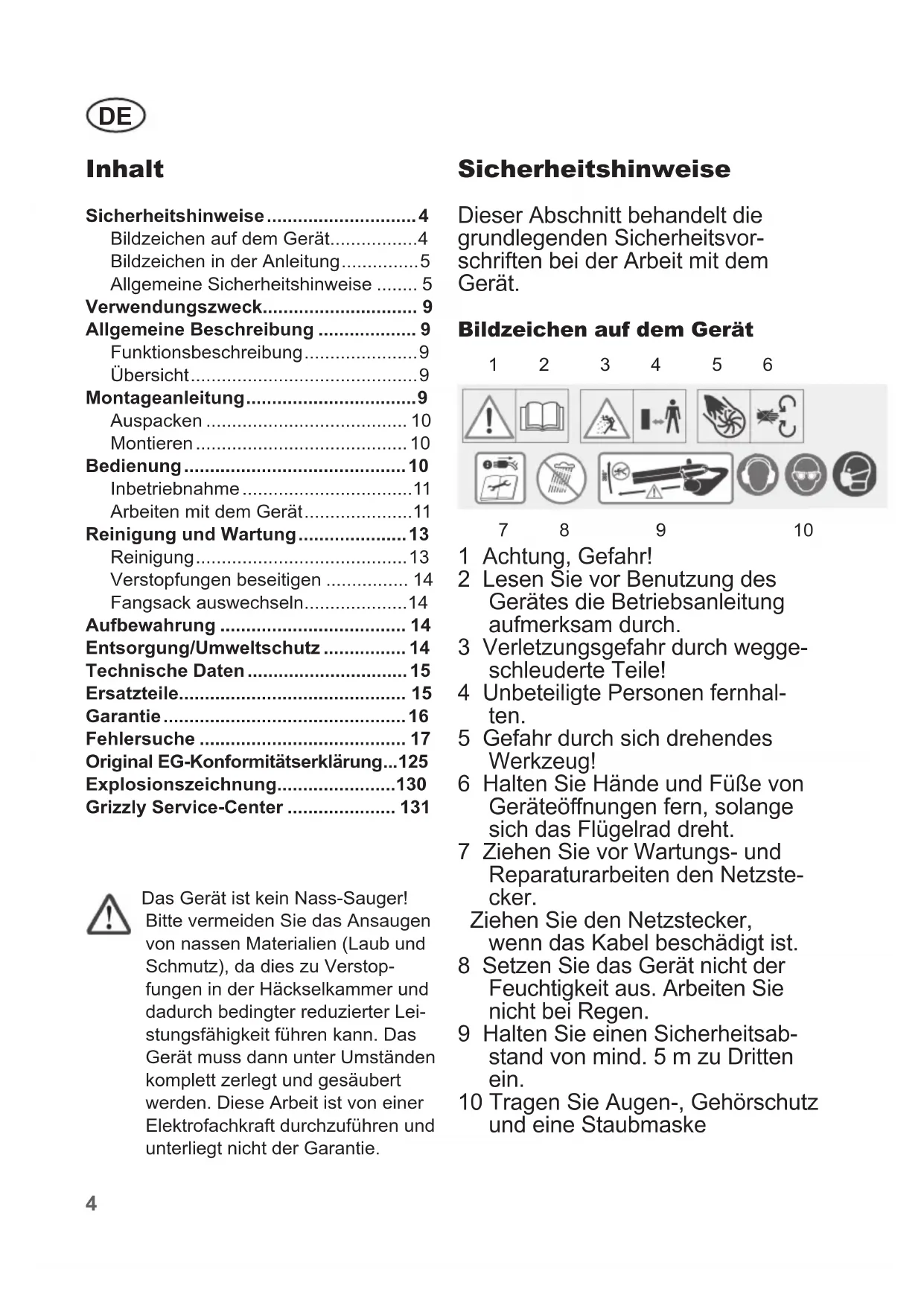 - Das Gerät ist kein Nass-Sauger! Bitte vermeiden Sie das Ansaugen von nassen Materialien (Laub und Schmutz), da dies zu Verstop- fungen in der Häckselkammer und dadurch bedingter reduzierter Lei- stungsfähigkeit führen kann. Das Gerät muss dann unter Umständen komplett zerlegt und gesäubert werden. Diese Arbeit ist von einer Elektrofachkraft durchzuführen und unterliegt nicht der Garantie. Original EG-Konformitätserklärung p. 125