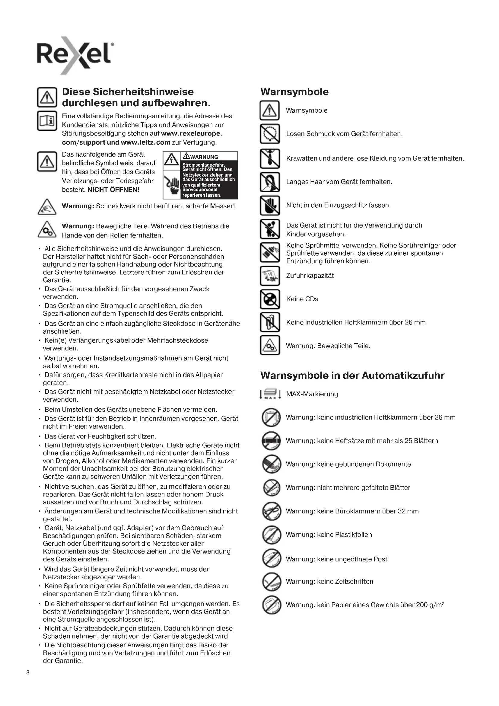 Diese Sicherheitshinweise durchlesen und aufbewahren. Eine vollständige Bedienungsanleitung, die Adresse des Kundendiensts, nützliche Tipps und Anweisungen zur Störungsbeseitigung stehen auf www.rexeleurope. com/support und www.leitz.com zur Verfügung. Losen Schmuck vom Gerät fernhalten. Krawatten und andere lose Kleidung vom Gerät fernhalten. Warnsymbole Langes Haar vom Gerät fernhalten. Nicht in den Einzugsschlitz fassen. Warnsymbole Zufuhrkapazität Keine CDs Keine industriellen Heftklammern über 26 mm Warnung: Bewegliche Teile. Warnung: Schneidwerk nicht berühren, scharfe Messer! Warnung: Bewegliche Teile. Während des Betriebs die Hände von den Rollen fernhalten. Das Gerät ist nicht für die Verwendung durch Kinder vorgesehen. Keine Sprühmittel verwenden. Keine Sprühreiniger oder Sprühfette verwenden, da diese zu einer spontanen Entzündung führen können. Warnung: keine industriellen Heftklammern über 26 mm Warnung: keine gebundenen Dokumente Warnung: keine Heftsätze mit mehr als 25 Blättern Warnsymbole in der Automatikzufuhr Warnung: nicht mehrere gefaltete Blätter Warnung: keine Büroklammern über 32 mm MAX-Markierung Warnung: keine Zeitschriften Warnung: kein Papier eines Gewichts über 200 g/m² Warnung: keine Plastikfolien Warnung: keine ungeönete Post999 Symbol Art Modell Taste/Anzeige und Aktion Startautomatik und Standby (einmal drücken) Rückwärtsbetrieb (gedrückt halten) Manueller Vorwärtsbetrieb (gedrückt halten) Bereitschaftsanzeige Überhitzungsanzeige (Gerät abkühlen lassen) Überlastungs-/Stauanzeige (weniger Blätter einlegen/Stau beseitigen) Abfallbehälteranzeige (Gerät önen und Behälter leeren; 45X: Schneidwerk abnehmen und Behälter leeren) Anzeige „Gerät geönet“ oder „Schneidwerk nicht eingesetzt“ (Gerät vollständig schließen bzw. Schneidwerk auf den Behälter setzen) Anzeige „Automatikzufuhr verriegelt“ (Entriegelung durch Eingabe eines 4-stelligen Codes) Taste 1 für Automatikzufuhr- Verriegelungscode Taste 2 für Automatikzufuhr- Verriegelungscode Taste 3 für Automatikzufuhr- Verriegelungscode Taste 4 für Automatikzufuhr- Verriegelungscode Betrieb
