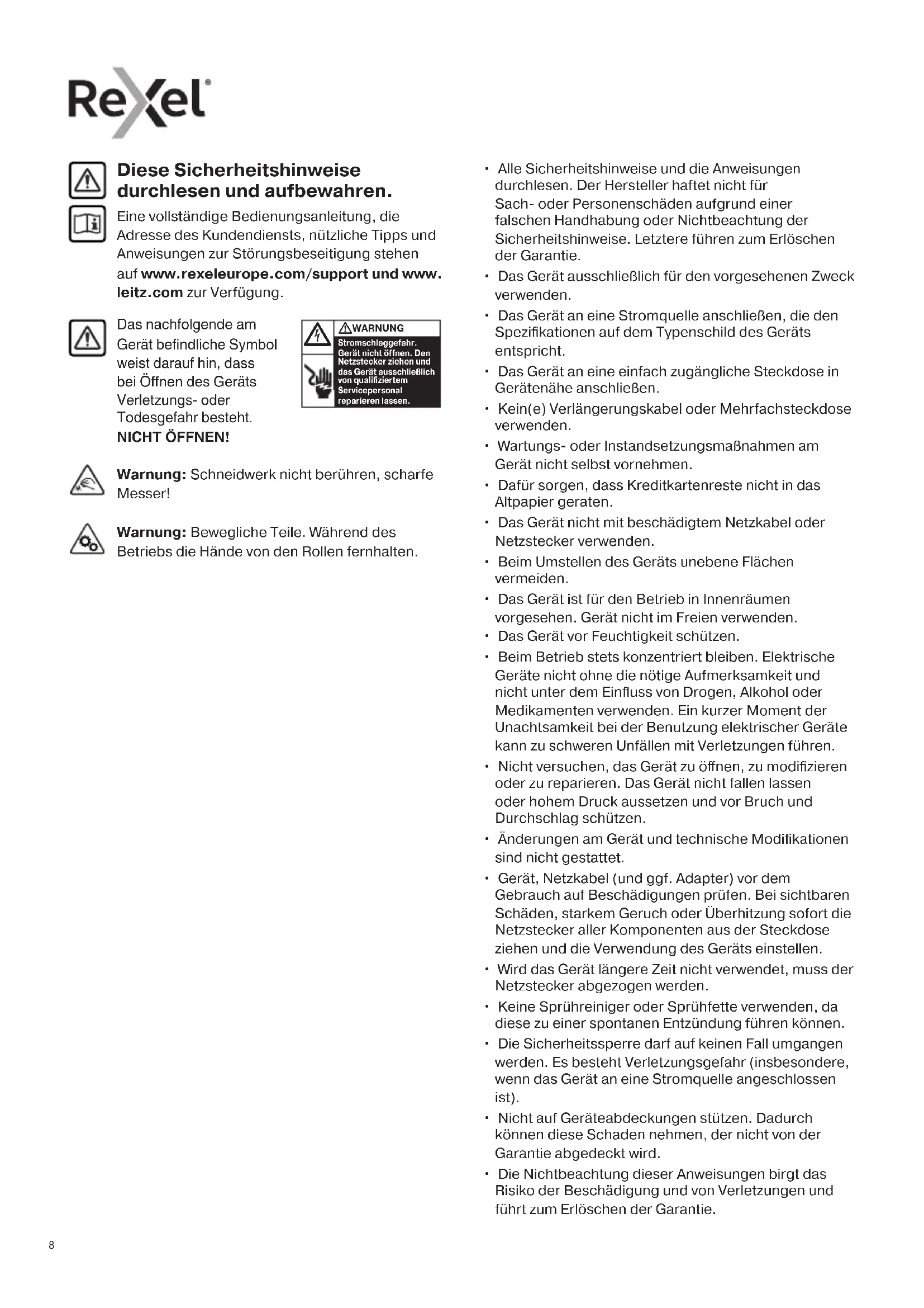 Diese Sicherheitshinweise durchlesen und aufbewahren. Eine vollständige Bedienungsanleitung, die Adresse des Kundendiensts, nützliche Tipps und Anweisungen zur Störungsbeseitigung stehen auf www.rexeleurope.com/support und www. leitz.com zur Verfügung. Warnung: Schneidwerk nicht berühren, scharfe Messer! Warnung: Bewegliche Teile. Während des Betriebs die Hände von den Rollen fernhalten.999 Losen Schmuck vom Gerät fernhalten. Krawatten und andere lose Kleidung vom Gerät fernhalten. Warnsymbole Langes Haar vom Gerät fernhalten. Nicht in den Einzugsschlitz fassen. Warnsymbole Zufuhrkapazität Keine CDs Keine industriellen Heftklammern über 26 mm Warnung: Bewegliche Teile. Das Gerät ist nicht für die Verwendung durch Kinder vorgesehen. Keine Sprühmittel verwenden. Keine Sprühreiniger oder Sprühfette verwenden, da diese zu einer spontanen Entzündung führen können. Symbol Art Schiebeschalter/ Anzeige Bedientasten Startautomatik und Standby (einmal drücken) Rückwärtsbetrieb Vorwärtsbetrieb Überhitzung (Gerät abkühlen lassen) Überlastungs-/ Stauanzeige (weniger Blätter einlegen/Stau beseitigen) Modelle mit Bedientasten Symbol Art Schiebeschalter/ Anzeige Schiebeschalter Betrieb automatisch starten Rückwärtsbetrieb Vorwärtsbetrieb Statusanzeigen Aus Betriebsbereit (darauf achten, dass das Schneidwerk richtig auf dem Abfallbehälter sitzt und der Schiebeschalter auf „Betrieb automatisch starten“ steht) Überhitzung (Gerät abkühlen lassen) Bedienelemente und Anzeigen Modelle mit Schiebeschalter Keine Kreditkarten Zubehör Nur Originalzubehör von Rexel verwenden: Schmiermittelblätter (20) - 2101949 Schmiermittelblätter (12) - 210194810 Medien zerkleinern KANN Folgendes zerkleinern: