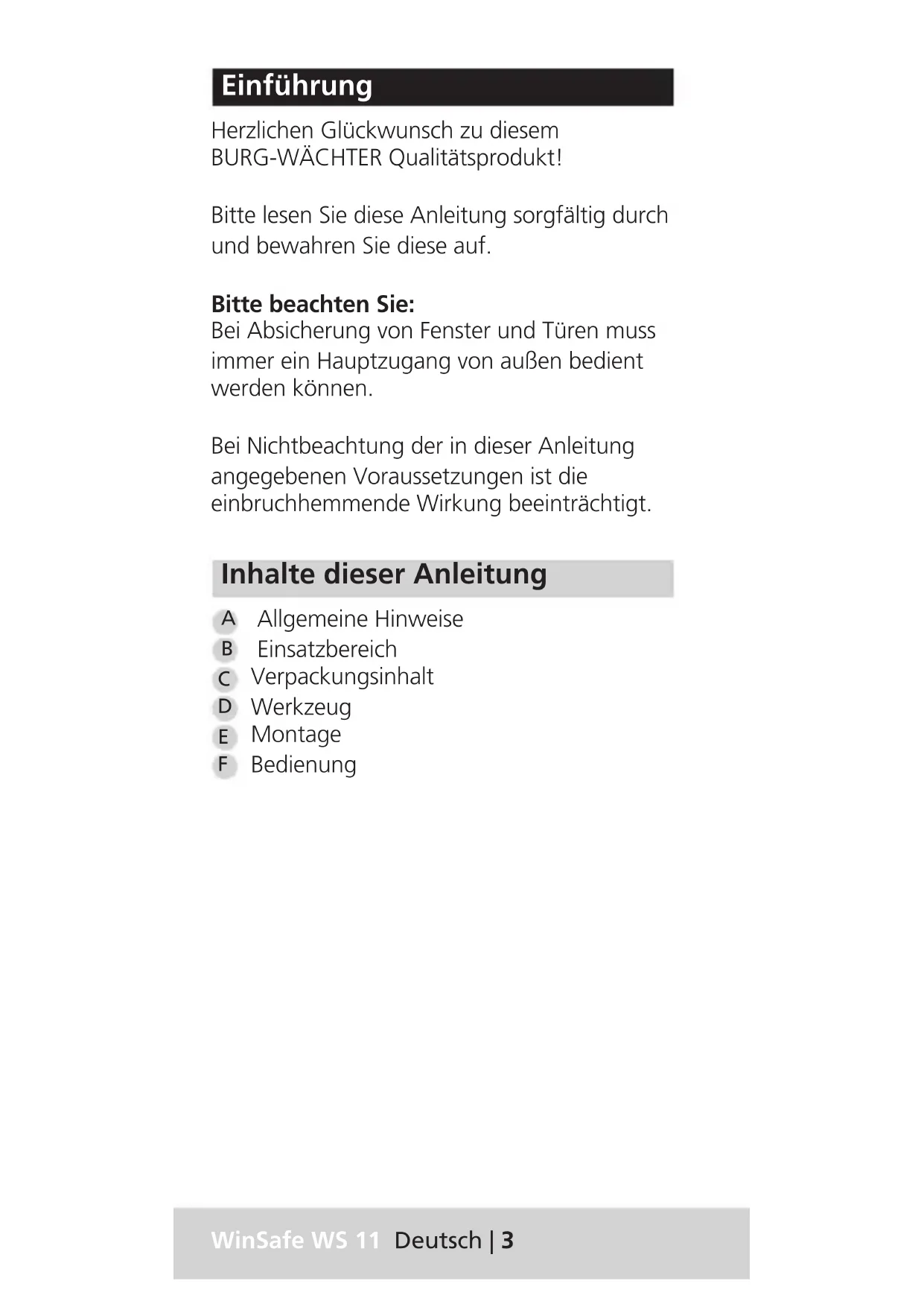 Montage- en gebruiksaanwijzingDeutsch 3 English 12 Français 21 Nederlands 30 Download: www.burg.biz Descarga: www.burg.biz Download: www.burg.biz Download: www.burg.biz Download: www.burg.biz Download: www.burg.biz Ladattava tiedosto: www.burg.biz λήψη: www.burg.biz İndir: www.burg.biz Descărcare: www.burg.biz Pobieranie pliku: www.burg.biz Stáhnout: www.burg.biz Letölthető: www.burg.biz Download: www.burg.biz Download: www.burg.biz Download: www.burg.biz загрузка: www.burg.biz Download (зареди): www.burg.biz Download: www.burg.biz Language 2 WinSafe WS 11WinSafe WS 11 Deutsch | 3 Einführung Herzlichen Glückwunsch zu diesem BURG-WÄCHTER Qualitätsprodukt! Bitte lesen Sie diese Anleitung sorgfältig durch und bewahren Sie diese auf. Bitte beachten Sie: Bei Absicherung von Fenster und Türen muss immer ein Hauptzugang von außen bedient werden können. Bei Nichtbeachtung der in dieser Anleitung angegebenen Voraussetzungen ist die einbruchhemmende Wirkung beeinträchtigt. Inhalte dieser Anleitung