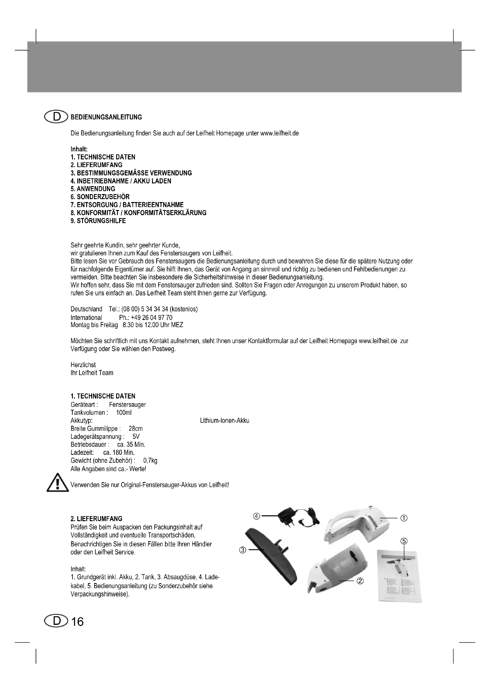 Sehr geehrte Kundin, sehr geehrter Kunde, wir gratulieren Ihnen zum Kauf des Fenstersaugers von Leifheit. Bitte lesen Sie vor Gebrauch des Fenstersaugers die Bedienungsanleitung durch und bewahren Sie diese für die spätere Nutzung oder für nachfolgende Eigentümer auf. Sie hilft Ihnen, das Gerät von Angang an sinnvoll und richtig zu bedienen und Fehlbedienungen zu vermeiden. Bitte beachten Sie insbesondere die Sicherheitshinweise in dieser Bedienungsanleitung. Wir hoffen sehr, dass Sie mit dem Fenstersauger zufrieden sind. Sollten Sie Fragen oder Anregungen zu unserem Produkt haben, so rufen Sie uns einfach an. Das Leifheit Team steht Ihnen gerne zur Verfügung. Deutschland Tel.: (08 00) 5 34 34 34 (kostenlos) International Ph.:+4926049770 Montag bis Freitag 8.30 bis 12.00 Uhr MEZ Möchten Sie schriftlich mit uns Kontakt aufnehmen, steht Ihnen unser Kontaktformular auf der Leifheit Homepage www.leifheit.de zur Verfügung oder Sie wählen den Postweg. Herzlichst Ihr Leifheit Team
