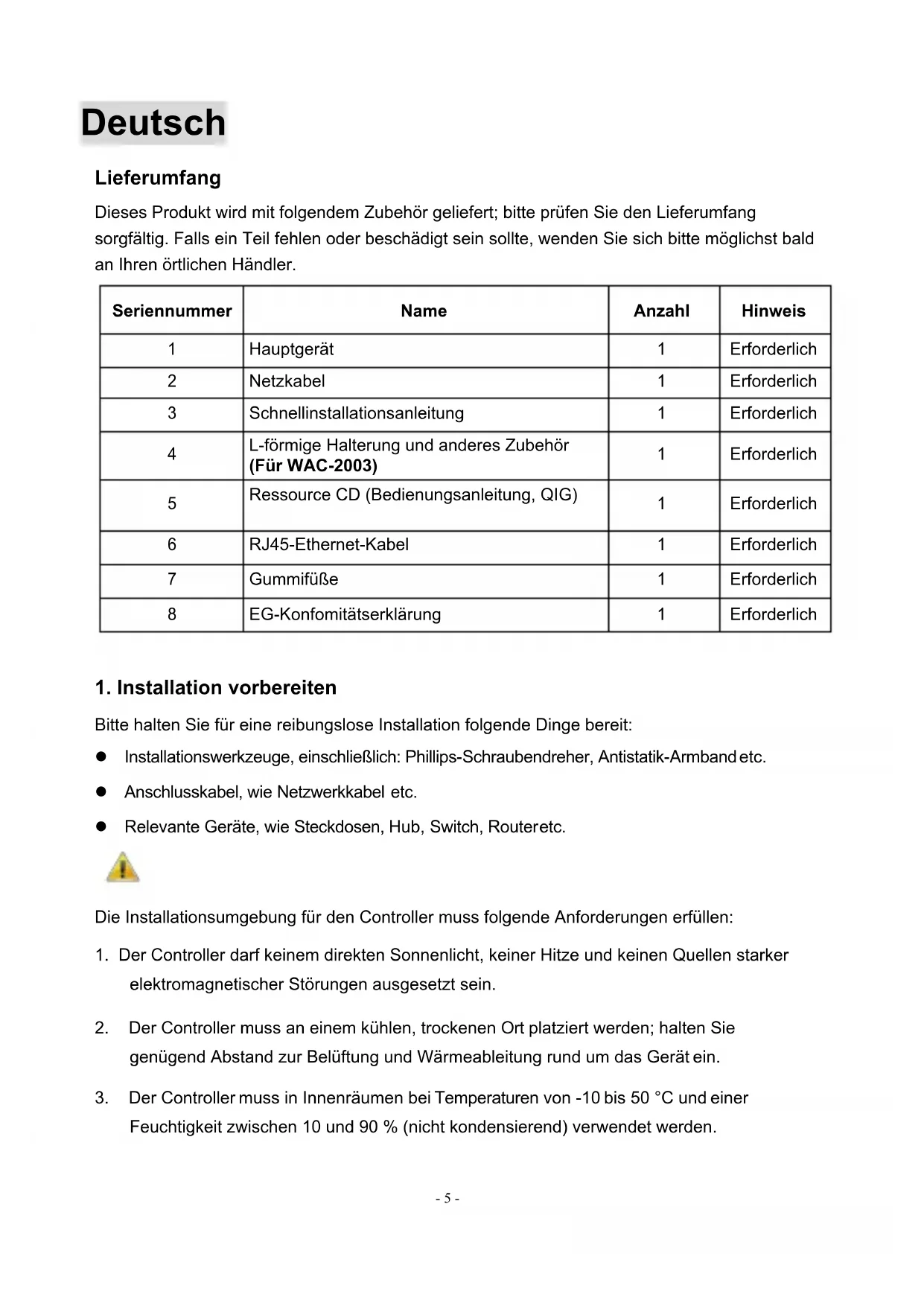 Bitte halten Sie für eine reibungslose Installation folgende Dinge bereit: l Installationswerkzeuge, einschließlich: Phillips-Schraubendreher, Antistatik-Armband etc. l Anschlusskabel, wie Netzwerkkabel etc. l Relevante Geräte, wie Steckdosen, Hub, Switch, Router etc. Die Installationsumgebung für den Controller muss folgende Anforderungen erfüllen: