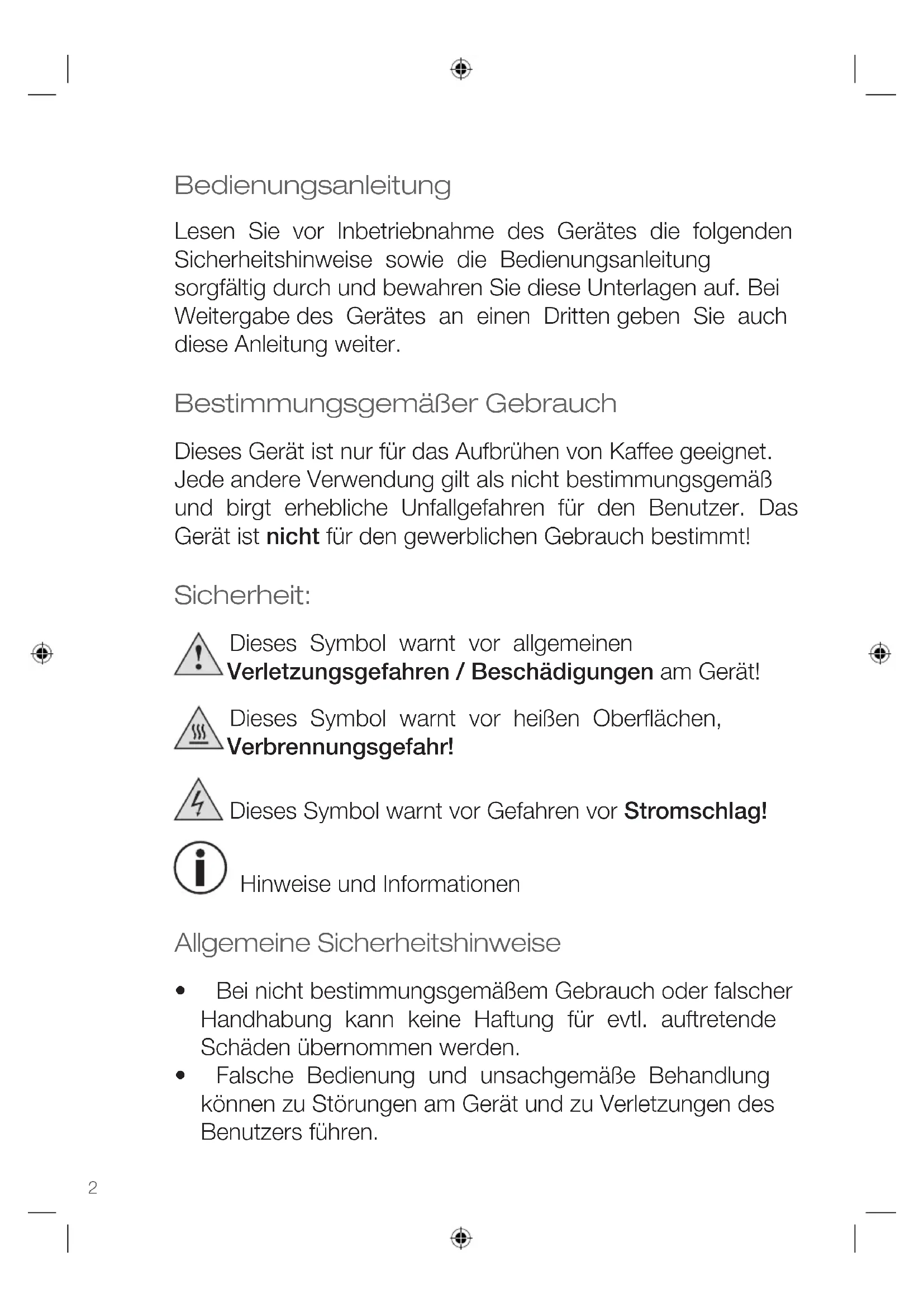 10665/106662 Bedienungsanleitung Lesen Sie vor Inbetriebnahme des Gerätes die folgenden Sicherheitshinweise sowie die Bedienungsanleitung sorgfältig durch und bewahren Sie diese Unterlagen auf. Bei Weitergabe des Gerätes an einen Dritten geben Sie auch diese Anleitung weiter. Bestimmungsgemäßer Gebrauch Dieses Gerät ist nur für das Aufbrühen von Kaffee geeignet. Jede andere Verwendung gilt als nicht bestimmungsgemäß und birgt erhebliche Unfallgefahren für den Benutzer. Das Gerät ist nicht für den gewerblichen Gebrauch bestimmt! Sicherheit: Dieses Symbol warnt vor allgemeinen Verletzungsgefahren / Beschädigungen am Gerät! Dieses Symbol warnt vor heißen Oberflächen, Verbrennungsgefahr! Dieses Symbol warnt vor Gefahren vor Stromschlag! Hinweise und Informationen Allgemeine Sicherheitshinweise