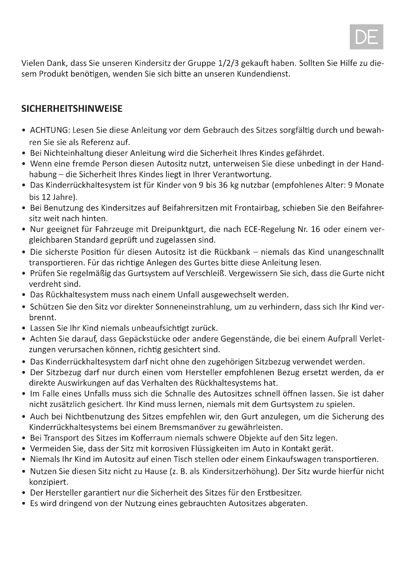 Das Gurtsystem kann mit einem Handwaschmi el, warmen Wasser und einem Schwamm von Hand gereinigt werden. Keine aggressiven Reiniger verwenden. Handwäsche Keine chemische Reinigung Nicht bügeln Reinigung mit milder SeifeKeine Bleiche verwenden Temperatur unter 30°EN We would like to congratulate you on your purchase of a group 1/2/3 car seat. If you would like to obtain any help regarding this product, you can contact our customer service. SAFETY INSTRUCTIONS