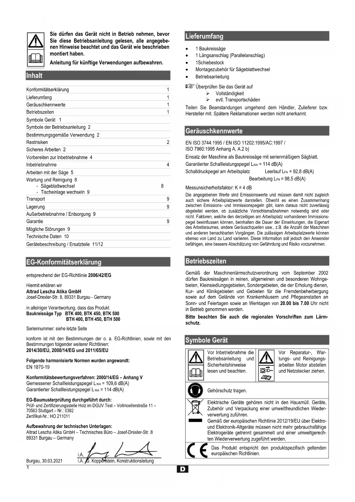 EG-Konformitätserklärung entsprechend der EG-Richtlinie 2006/42/EG Hiermit erklären wir Altrad Lescha Atika GmbH Josef-Drexler-Str. 8, 89331 Burgau - Germany in alleiniger Verantwortung, dass das Produkt Baukreissäge Typ BTK 400, BTK 450, BTK 500 BTH 400, BTH 450, BTH 500 Seriennummer: siehe letzte Seite konform ist mit den Bestimmungen der o. a. EG-Richtlinien, sowie mit den Bestimmungen folgender weiterer Richtlinien: 2014/30/EU, 2000/14/EG und 2011/65/EU Folgende harmonisierte Normen wurden angewandt: EN 1870-19 Konformitätsbewertungsverfahren: 2000/14/EG – Anhang V Gemessener Schallleistungspegel L