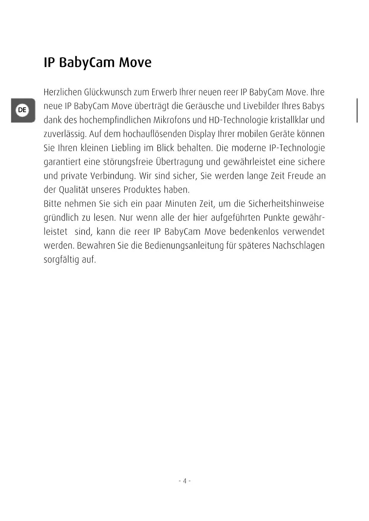 - Zoomen Sie mit zwei Fingern oder einem Doppelklick heraus, bis Sie wieder den vollen Bildausschnitt sehen DE- 16 - Garantie Bitte Kaufbeleg, Gebrauchsanleitung und Artikelnummer aufbewahren. Gewährleistungsansprüche oder Ansprüche aus Garantieversprechen sind ausschließlich mit dem Händler abzuwickeln. Alle technischen Daten, Informationen sowie Eigenschaften des in diesem Werk beschriebenen Produktes wurden nach bestem Wissen zusammengestellt und entsprechen dem Stand bei Veröffentlichung. Die von reer bereitgestellten Informationen sollten korrekt und zuverlässig sein. Die Firma reer übernimmt dennoch keinerlei Haftung für mögliche Fehler in diesem Dokument und behält sich das Recht vor, ohne vorherige Ankündigung, Änderungen am Produktdesign beziehungsweise an den Spezifikationen vorzunehmen. Vervielfältigung und Weitergabe von Informationen aus diesem urheberrechtlich geschützten Werk in irgendeiner Form oder auf irgendeine Weise, grafisch, elektronisch oder mechanisch, durch Fotokopieren, Aufzeichnen auf Band oder Speichern in einem Datenabfragesystem, auch auszugsweise, bedürfen einer vorherigen schriftlichen Genehmigung der Firma reer. Datenschutz Die Datenschutzbestimmungen können Sie im Hauptmenü unter dem Punkt Profil oder unter online auf www.reer.de nachlesen. DE- 17 - Dieses Produkt darf am Ende seiner Lebensdauer nicht über den normalen Hausmüll entsorgt werden, sondern muss an einer Sammelstelle für das Recycling von elektrischen Geräten abgegeben werden. Das Symbol auf dem Produkt, in der Gebrauchsanleitung oder auf der Verpackung weist darauf hin. Die Werkstoffe sind gemäß Ihrer Kennzeichnung wieder verwendbar. Werfen Sie verbrauchte Batterien nicht in den Hausmüll, sondern in den Sondermüll oder in eine Batterie-Sammelstation im Fachhandel. Mit der Wiederverwendung, der stofflichen Verwertung oder anderen Formen der Verwertung von Altgeräten leisten Sie einen wichtigen Beitrag zum Schutze unserer Umwelt. Bitte fragen Sie bei Ihrer Gemeindeverwaltung nach der zuständigen Entsorgungsstelle Hinweis zum Umweltschutz reer GmbH Muehlstr. 41 • 71229 Leonberg • Germany www.reer.de Betrieb in folgenden Ländern gestattet: DE, CH, AT, IT, FR, BE, NL, ES, LU, GR, HU, CZ, SI, PL, CY, DK, FI, IS, LI, LT, NO, RO, SE, SK, TR Hiermit erklärt die reer GmbH, dass der Funkanlagentyp IP BabyCam Move (Art.Nr.: 80310) der Richtlinie 2014/53/EU entspricht. Der vollständige Text der EU-Konformitätserklärung ist unter der folgenden Internetadresse verfügbar: http://www.reer.de DE- 18 - IP BabyCam Move Congratulations on the purchase of your new reer IP BabyCam Move. With its sensitive microphone and HD technology, the new IP BabyCam Move transmits the sounds and the live video of your baby reliably and with crystal clarity. You can use the high-resolution display of your mobile devices to always keep an eye on your little darling. The latest IP technology guarantees interruption-free transmission and guarantees secure and private connection. We are sure you will enjoy the quality of our product for many years to come. Please take a few minutes to read through the safety instructions carefully. You will only be able to use the reer IP BabyCam Move with confidence if all of the points mentioned here have been checked. Please keep the instruction manual in a safe place for future reference. GB- 19 - Scope of delivery VBC-69 Manual Technology Digital IP Frequency 2,4 GHz Transmitter baby unit camera Power supply with mains adaptor Input 110 – 240 V / 50 Hz / 0.3 A Output 5 V / 1,5 A Transmitter power 9,8 dBm Field of view of the lens 100° Camera movement horizontal 330° Camera movement vertical 110° Range Unlimited Cable length 1,50 m Operating temperature -9°C – +55°C