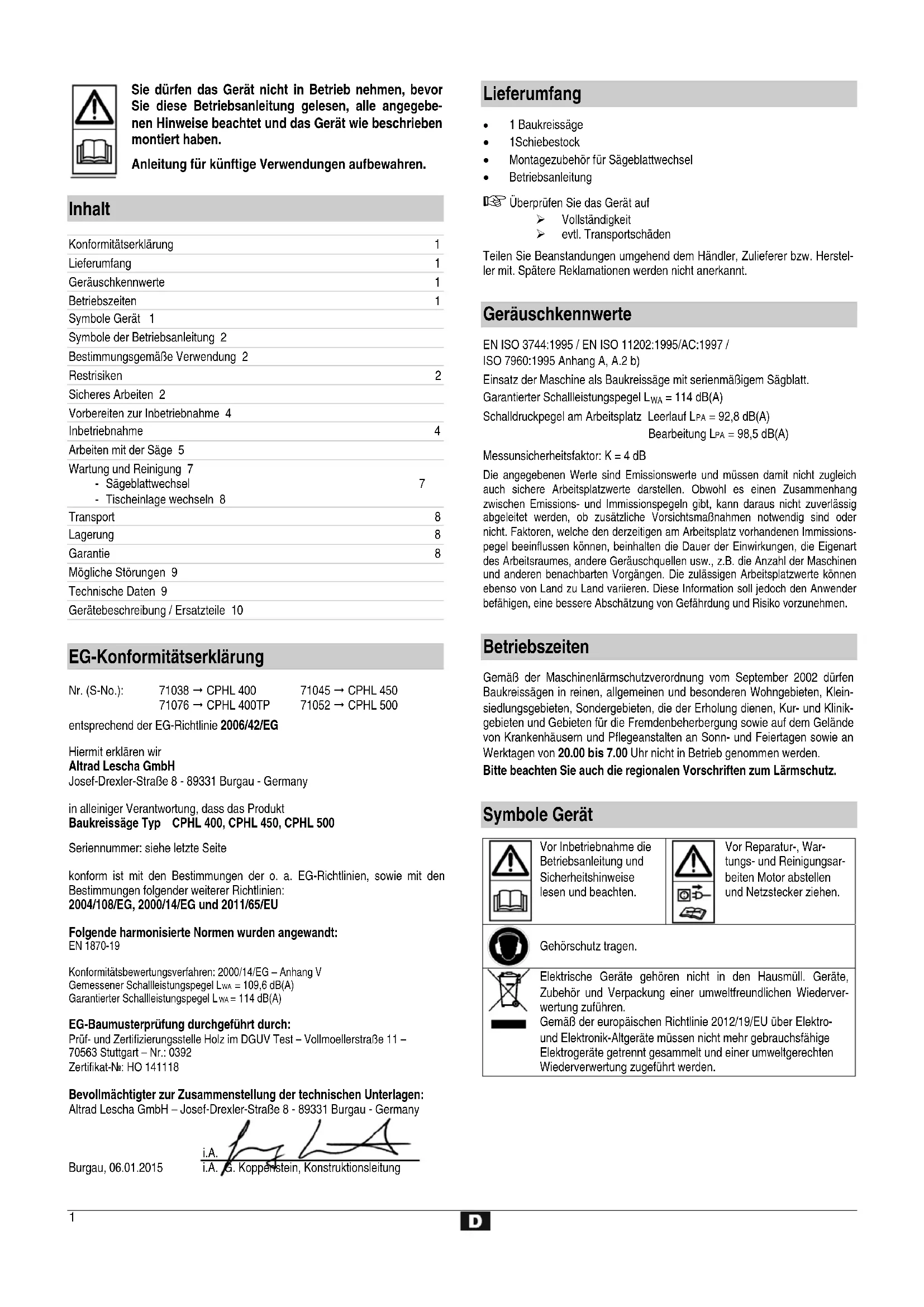 entsprechend der EG-Richtlinie 2006/42/EG Hiermit erklären wir Altrad Lescha GmbH Josef-Drexler-Straße 8 - 89331 Burgau - Germany in alleiniger Verantwortung, dass das Produkt Baukreissäge Typ CPHL 400, CPHL 450, CPHL 500 Seriennummer: siehe letzte Seite konform ist mit den Bestimmungen der o. a. EG-Richtlinien, sowie mit den Bestimmungen folgender weiterer Richtlinien: 2004/108/EG, 2000/14/EG und 2011/65/EU Folgende harmonisierte Normen wurden angewandt: EN 1870-19 Konformitätsbewertungsverfahren: 2000/14/EG – Anhang V Gemessener Schallleistungspegel L = 109,6 dB(A) Garantierter Schallleistungspegel L = 114 dB(A) EG-Baumusterprüfung durchgeführt durch: Prüf- und Zertifizierungsstelle Holz im DGUV Test – Vollmoellerstraße 11 – 70563 Stuttgart – Nr.: 0392 Zertifikat-Nr.: HO 141118 Bevollmächtigter zur Zusammenstellung der technischen Unterlagen: Altrad Lescha GmbH – Josef-Drexler-Straße 8 - 89331 Burgau - Germany