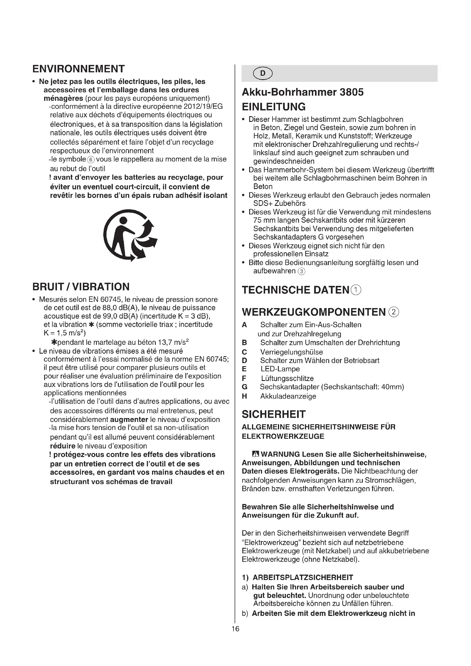 a) Lassen Sie Ihr Elektrowerkzeug nur von qualiziertem Fachpersonal und nur mit Original- Ersatzteilen reparieren. Damit wird sichergestellt, dass die Sicherheit des Elektrowerkzeuges erhalten bleibt. b) Warten Sie niemals beschädigte Akkus. Sämtliche Wartung von Akkus sollte nur durch den Hersteller oder bevollmächtigte Kundendienststellen erfolgen.19 sind, andernfalls sind kürzere Sechskantbits mit Sechskant-Adapter G zu verwenden ! keine Bits mit beschädigtem Schaft benutzen