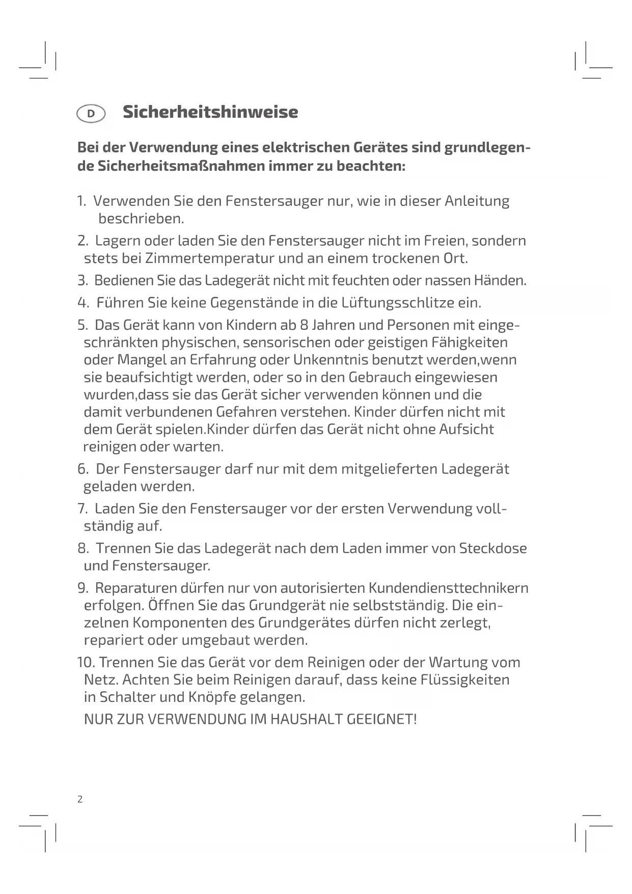 1. Verwenden Sie den Fenstersauger nur, wie in dieser Anleitung