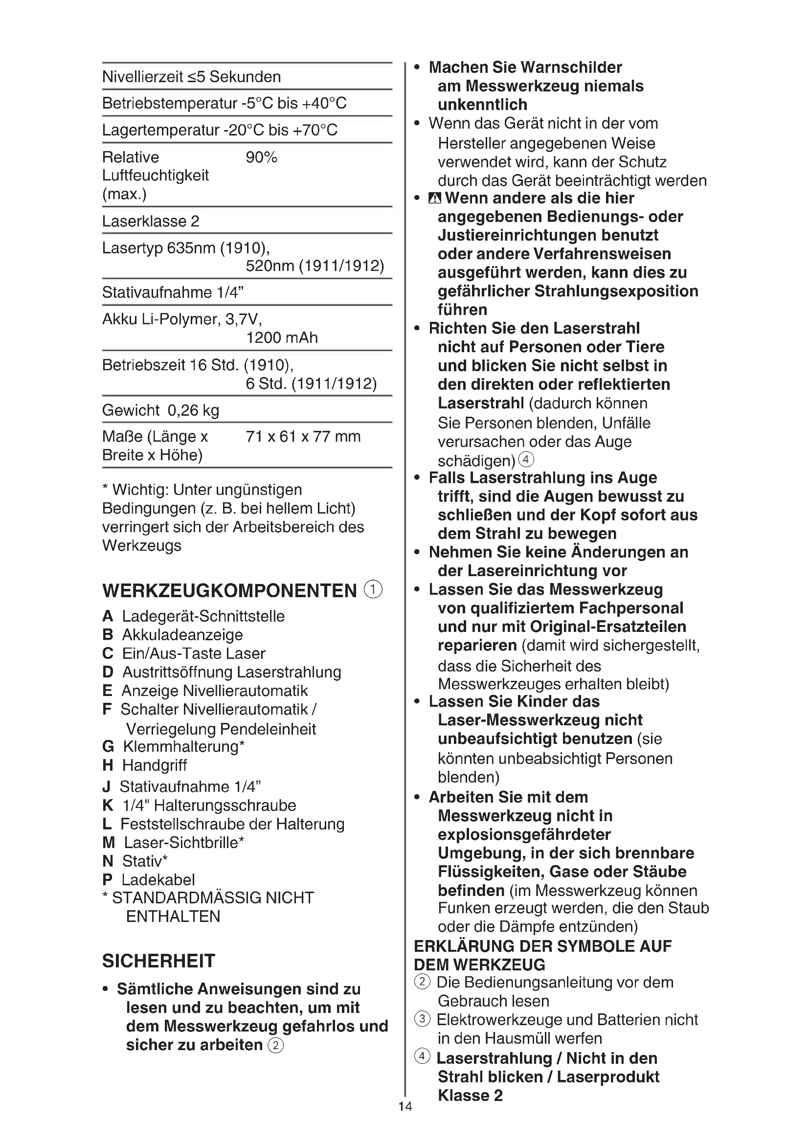 Laserstrahlung / Nicht in den Strahl blicken / Laserprodukt Klasse 2 Nivellierzeit ≤5 Sekunden Betriebstemperatur -5°C bis +40°C Lagertemperatur -20°C bis +70°C Relative Luftfeuchtigkeit (max.) 90% Laserklasse 2 Lasertyp 635nm (1910), 520nm (1911/1912) Stativaufnahme 1/4” Akku Li-Polymer, 3,7V, 1200 mAh Betriebszeit 16 Std. (1910), 6 Std. (1911/1912) Gewicht 0,26 kg Maße (Länge x Breite x Höhe) 71 x 61 x 77 mm