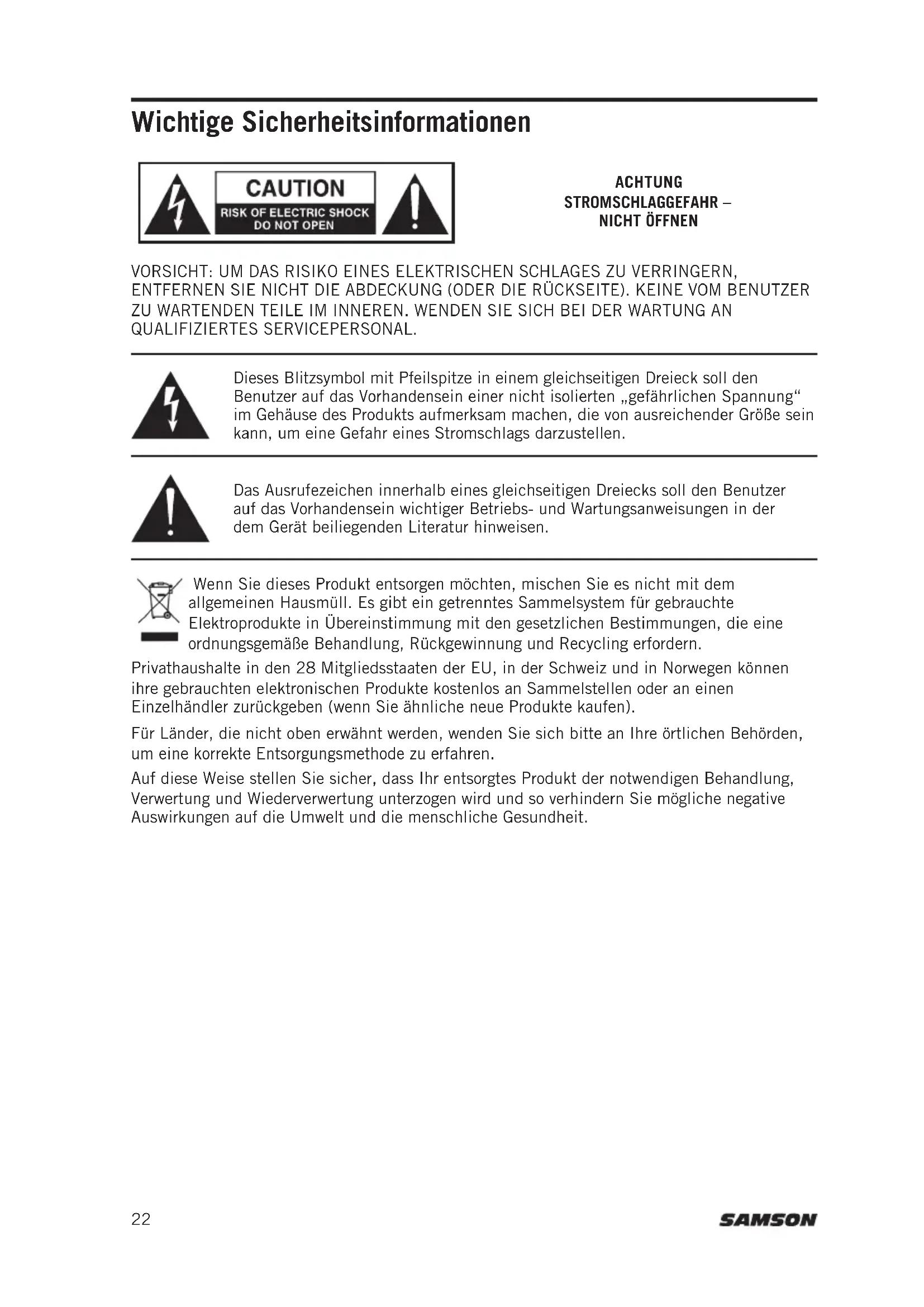 RL112A RL115A Puissance de sortie Crête de 800 watts (700 LF + 100 HF) 400 Watts RMS (350 LF + 50 HF) Max. SPL (1M) 120dB 122dB Réponse en fréquence 58Hz - 20KHz 50Hz - 20kHz Basse Fréquence Woofer 12" (305mm) Bobine acoustique de 2po (50.8mm) Woofer 15" (381mm) Bobine acoustique de 2 po (50.8mm) Haute Fréquence Haut-parleur au néodyme de 1 po (25,4mm) Bobine acoustique de 1 po (25,4 mm) Commande de répartition Fréquence : 2,5 kHz Type : 12dB/Oct Couverture du cornet 90°H x 60°V Entrées XLR symétrique ”1/4” Combo, XPD USB sans fil Sortie Sortie ligne XLR symétrique Égalisation du profil 100Hz & 12kHz Boost Protection électronique Thermique, Surcharge, Limiteur Analogique (Optique), Compresseur Connecteur CA 3 broches IEC 250 VAC, 20 A mâle Consommation d’énergie 420 W Fusible 110V-120V T4A AC250V ; 220V-240V T2A AC250V Boîtier Polypropylène Grille Entièrement en métal perforé Poignées Deux côtés, un dessus Angle de l’affichage 45° Méthode de montage Prise de montage sur poteau de 1-38 po (35 mm) Dimensions (LxLxH) 15" x 12.9" x 23.9" 380mm x 327mm x 606.5mm 15.2" x 14" x 24.9" 386mm x 356mm x 631.5mm Poids de l'appareil 30,8 lb / 14 kg 32,6lb / 14,8kg Caractéristiques techniques Chez Samson, nous améliorons continuellement nos produits, donc les spécifications et les images sont sujettes à changement sans préavis. 21RL112A / RL115AWenn Sie dieses Produkt entsorgen möchten, mischen Sie es nicht mit dem allgemeinen Hausmüll. Es gibt ein getrenntes Sammelsystem für gebrauchte Elektroprodukte in Übereinstimmung mit den gesetzlichen Bestimmungen, die eine ordnungsgemäße Behandlung, Rückgewinnung und Recycling erfordern. Privathaushalte in den 28 Mitgliedsstaaten der EU, in der Schweiz und in Norwegen können ihre gebrauchten elektronischen Produkte kostenlos an Sammelstellen oder an einen Einzelhändler zurückgeben (wenn Sie ähnliche neue Produkte kaufen). Für Länder, die nicht oben erwähnt werden, wenden Sie sich bitte an Ihre örtlichen Behörden, um eine korrekte Entsorgungsmethode zu erfahren. Auf diese Weise stellen Sie sicher, dass Ihr entsorgtes Produkt der notwendigen Behandlung, Verwertung und Wiederverwertung unterzogen wird und so verhindern Sie mögliche negative Auswirkungen auf die Umwelt und die menschliche Gesundheit. Wichtige Sicherheitsinformationen VORSICHT: UM DAS RISIKO EINES ELEKTRISCHEN SCHLAGES ZU VERRINGERN, ENTFERNEN SIE NICHT DIE ABDECKUNG (ODER DIE RÜCKSEITE). KEINE VOM BENUTZER ZU WARTENDEN TEILE IM INNEREN. WENDEN SIE SICH BEI DER WARTUNG AN QUALIFIZIERTES SERVICEPERSONAL. Dieses Blitzsymbol mit Pfeilspitze in einem gleichseitigen Dreieck soll den Benutzer auf das Vorhandensein einer nicht isolierten „gefährlichen Spannung“ im Gehäuse des Produkts aufmerksam machen, die von ausreichender Größe sein kann, um eine Gefahr eines Stromschlags darzustellen. Das Ausrufezeichen innerhalb eines gleichseitigen Dreiecks soll den Benutzer auf das Vorhandensein wichtiger Betriebs- und Wartungsanweisungen in der dem Gerät beiliegenden Literatur hinweisen. ACHTUNG STROMSCHLAGGEFAHR – NICHT ÖFFNEN 22ENGLISH