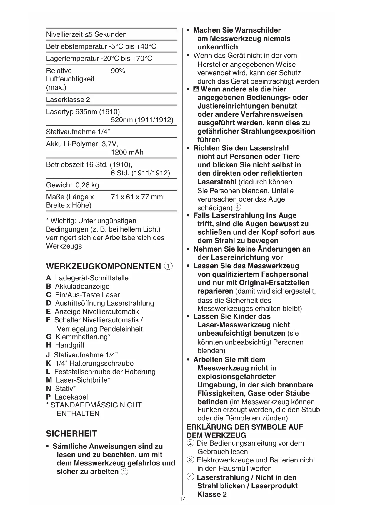 Laserstrahlung / Nicht in den Strahl blicken / Laserprodukt Klasse 2 Nivellierzeit ≤5 Sekunden Betriebstemperatur -5°C bis +40°C Lagertemperatur -20°C bis +70°C Relative Luftfeuchtigkeit (max.) 90% Laserklasse 2 Lasertyp 635nm (1910), 520nm (1911/1912) Stativaufnahme 1/4” Akku Li-Polymer, 3,7V, 1200 mAh Betriebszeit 16 Std. (1910), 6 Std. (1911/1912) Gewicht 0,26 kg Maße (Länge x Breite x Höhe) 71 x 61 x 77 mm