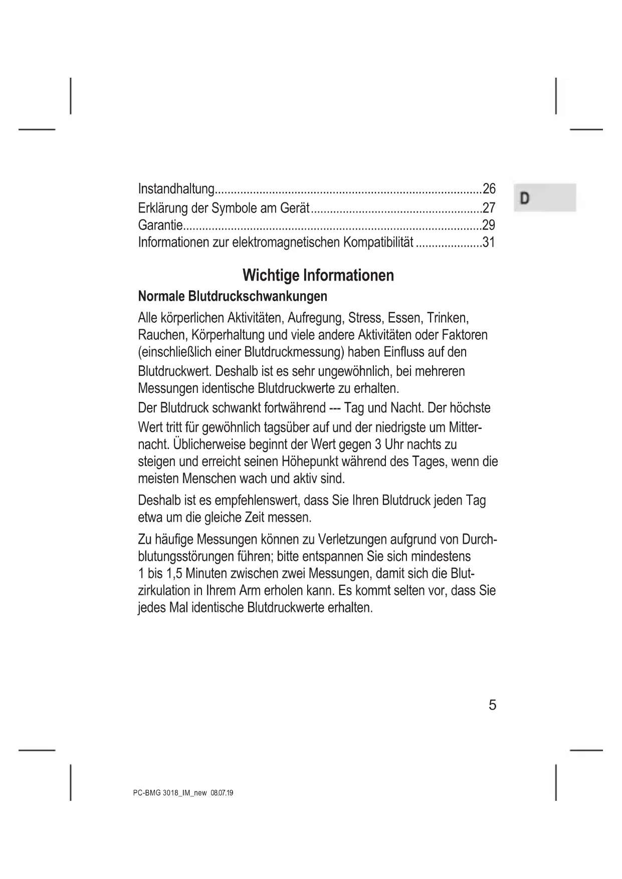 zu desinzieren (z. B. im Krankenhaus oder Klinikbetrieb). Wischen Sie die Innenseite (die Seite, die mit der Haut in Berüh- rung kommt) mit einem weichen Tuch, das mit Ethanol (75 - 90 %) befeuchtet und dann ausgedrückt wurde und lassen Sie die Manschette dann an der Luft trocknen. Erklärung der Symbole am Gerät Symbol für „DIE BETRIEBSANLEITUNG MUSS GELESEN WERDEN“ (Symbol = weiß mit blauem Hintergrund) Symbol für „WARNUNG“ Symbol für „ANWENDUNGSTEIL TYP BF“ (Die Manschette ist ein Anwendungsteil des Typen BF)28 PC-BMG 3018_IM_new 08.07.19 Symbol für „UMWELTSCHUTZ“ - Elektrische Produkte sollten nicht mit dem Haushaltsmüll entsorgt werden. Bitte recyceln, wenn es eine entsprechende Anlage gibt. Fragen Sie bei der Kreisverwaltung oder beim Einzel- händler nach Tipps zum Recyceln. Symbol für „HERSTELLER“ Die CE-Kennzeichnung bezeichnet die Konformi- tät mit den grundlegenden Anforderungen der Richtlinie 93 / 42 / EEC für Medizinprodukte. Symbol für „HERSTELLUNGSDATUM“ Symbol für „EUROPÄISCHE VERTRETUNG“