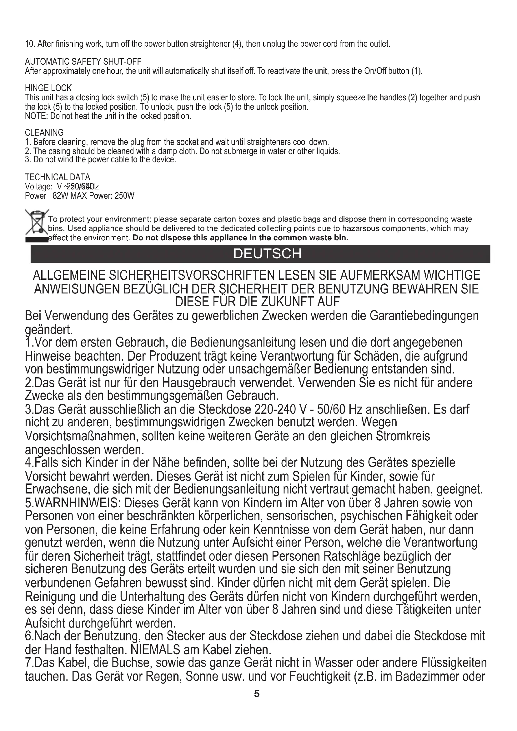 10. Nach Beendigung des Glättens den Haarglätter mithilfe eines Druckknopfes des Ausschalters (4) ausschalten, nächstens den Stecker der Speiseleitung aus der Steckdose ziehen. AUTOMATISCHE SICHERHEITSABSCHALTUNG Nach ungefähr einer Stunde schaltet sich das Gerät automatisch ab. Um das Gerät wieder zu aktivieren, drücken Sie die Ein / Aus-Taste (1). Scharnierverriegelung Dieses Gerät verfügt über einen Schließsperrschalter (5), um die Aufbewahrung des Geräts zu erleichtern. Um das Gerät zu verriegeln, drücken Sie einfach die Griffe (2) zusammen und drücken Sie die Verriegelung (5) in die verriegelte Position. Zum Entriegeln drücken Sie die Verriegelung (5) in die Entriegelungsposition. HINWEIS: Erwärmen Sie das Gerät nicht in der gesperrten Position. 220-240