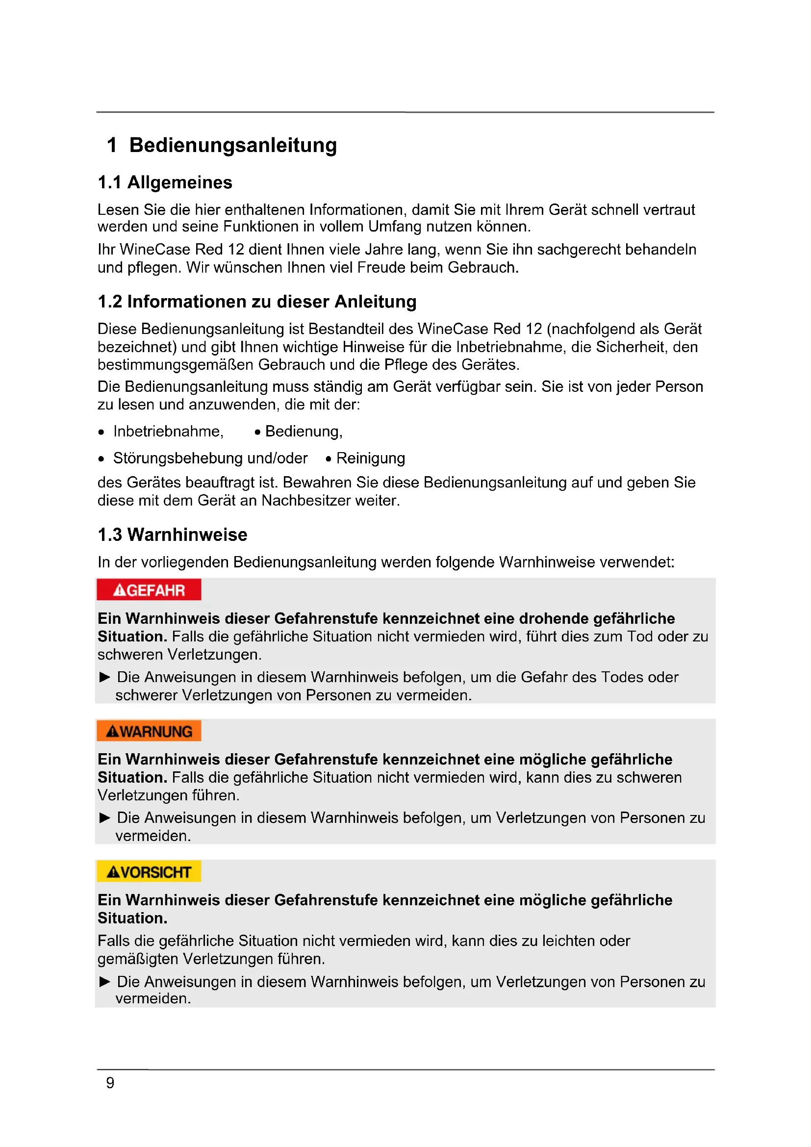 Diese Bedienungsanleitung ist Bestandteil des WineCase Red 12 (nachfolgend als Gerät bezeichnet) und gibt Ihnen wichtige Hinweise für die Inbetriebnahme, die Sicherheit, den bestimmungsgemäßen Gebrauch und die Pflege des Gerätes. Die Bedienungsanleitung muss ständig am Gerät verfügbar sein. Sie ist von jeder Person zu lesen und anzuwenden, die mit der: Inbetriebnahme, Bedienung, Störungsbehebung und/oder Reinigung des Gerätes beauftragt ist. Bewahren Sie diese Bedienungsanleitung auf und geben Sie diese mit dem Gerät an Nachbesitzer weiter.
