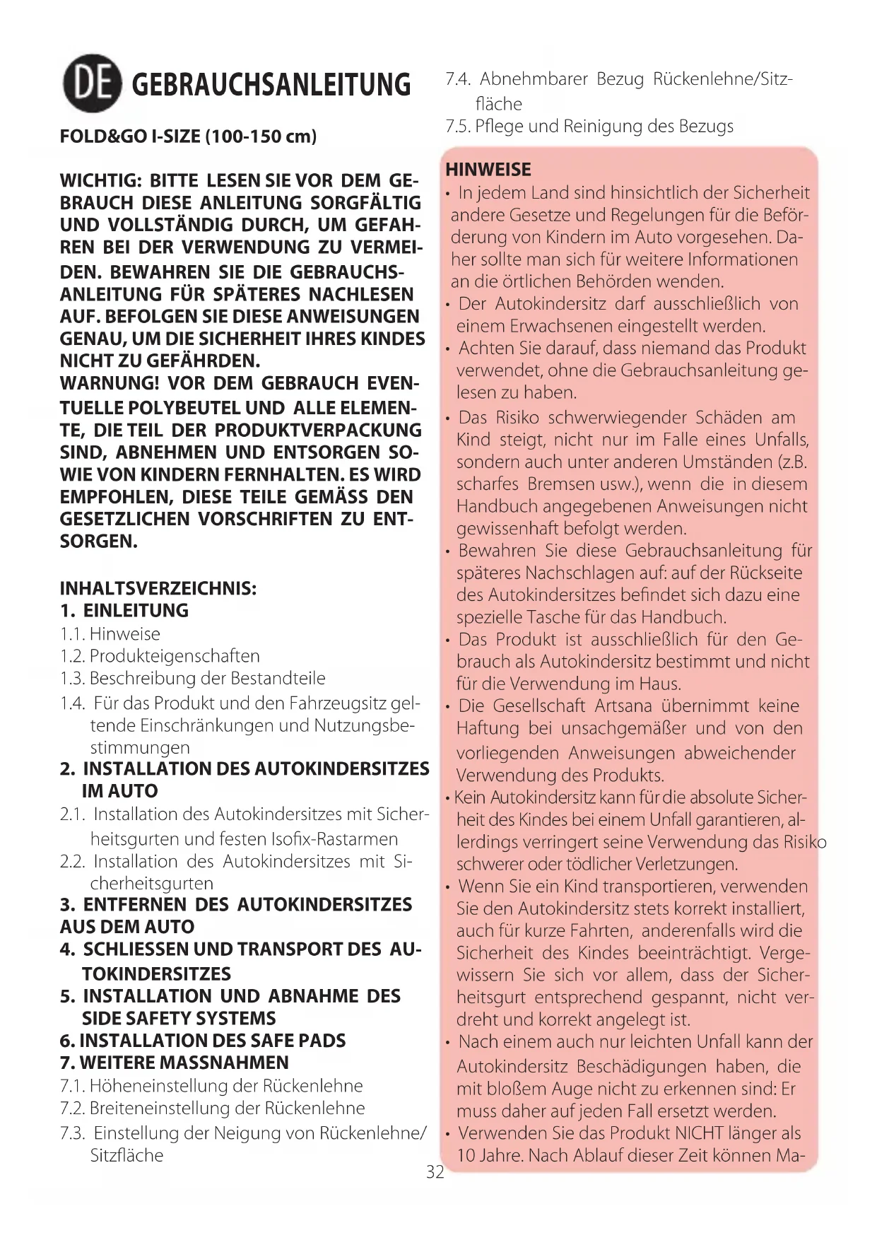 Ist die für den Autokindersitz vorgesehene Gebrauchsgrenze erreicht, entsorgen Sie ihn. Aus Umweltschutzgründen müssen die ver- schiedenen Einzelteile des Autokindersitzes getrennt und die Entsorgungsbestimmungen Ihres Landes befolgt werden. GARANTIE Die Garantie gilt bei allen Konformitätsfehlern, die trotz normaler Gebrauchsbedingungen (gemäß den Vorgaben der Gebrauchsanlei- tung) auftreten. Die Garantie ist verwirkt bei unsachgemäßem Gebrauch, Abnutzung oder bei persönlichen Unglücksfällen. Für die Lauf- zeit der Garantie auf Konformitätsmängel wird auf die besonderen Bestimmungen der natio- nalen Gesetzesvorschriften verwiesen, die im Land des Kaufs gelten, soweit vorgesehen.40 INSTRUCCIONES DE USO FOLD&GO I-SIZE (100-150 cm)