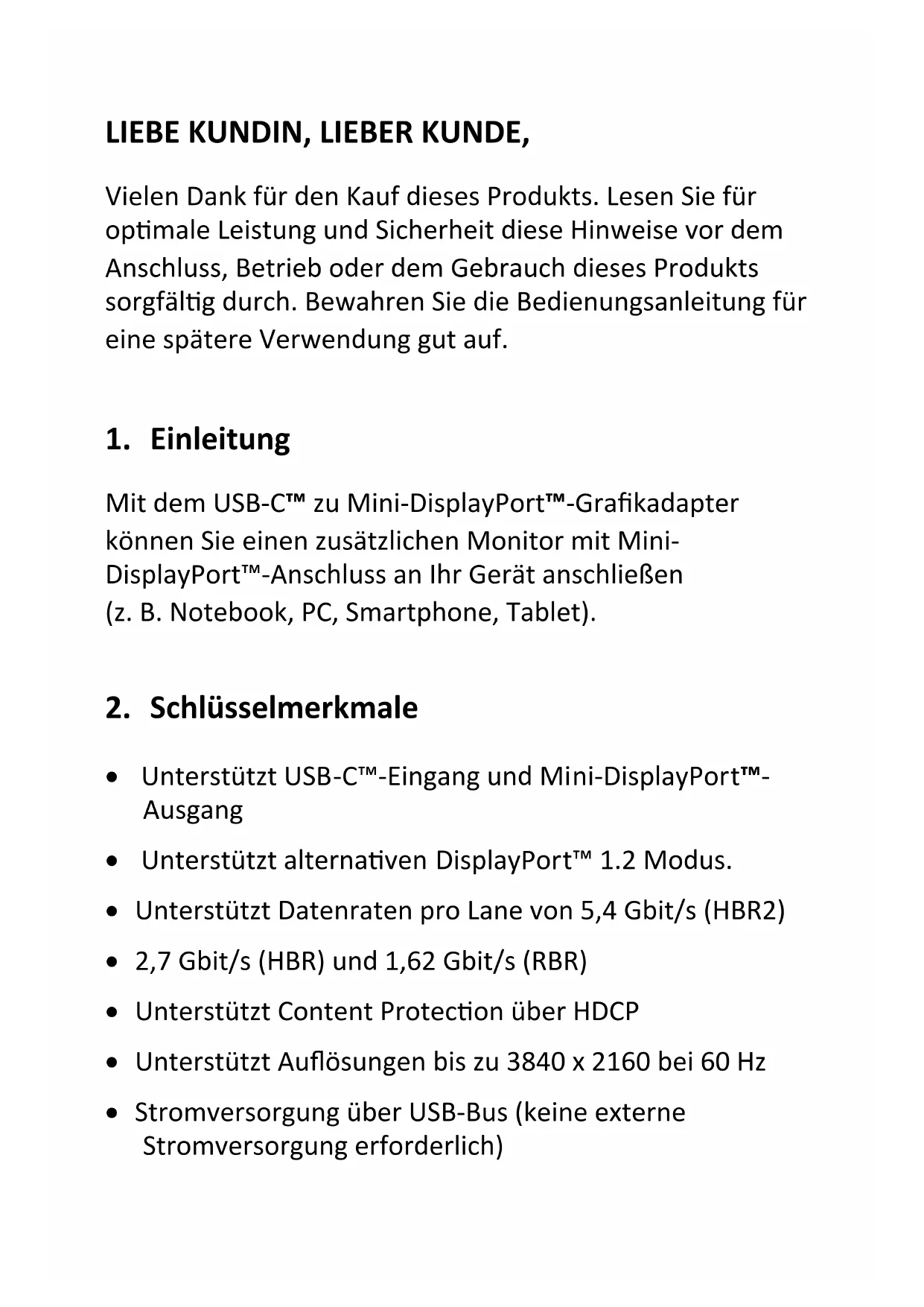 Notebook Mini DisplayPort™ MonitorHereby Assmann Electronic GmbH, declares that the Declaration of Conformity is part of the shipping content. If the Declaration of Conformity is missing, you can request it by post under the below mentioned manufacturer address. www.assmann.com Assmann Electronic GmbH Auf dem Schüffel 3 58513 Lüdenscheid GermanyUSB Type-C™ 4K Mini-DisplayPort™ Grafikadapter Benutzerhandbuch DA-70878LIEBE KUNDIN, LIEBER KUNDE, Vielen Dank für den Kauf dieses Produkts. Lesen Sie für optimale Leistung und Sicherheit diese Hinweise vor dem Anschluss, Betrieb oder dem Gebrauch dieses Produkts sorgfältig durch. Bewahren Sie die Bedienungsanleitung für eine spätere Verwendung gut auf.
