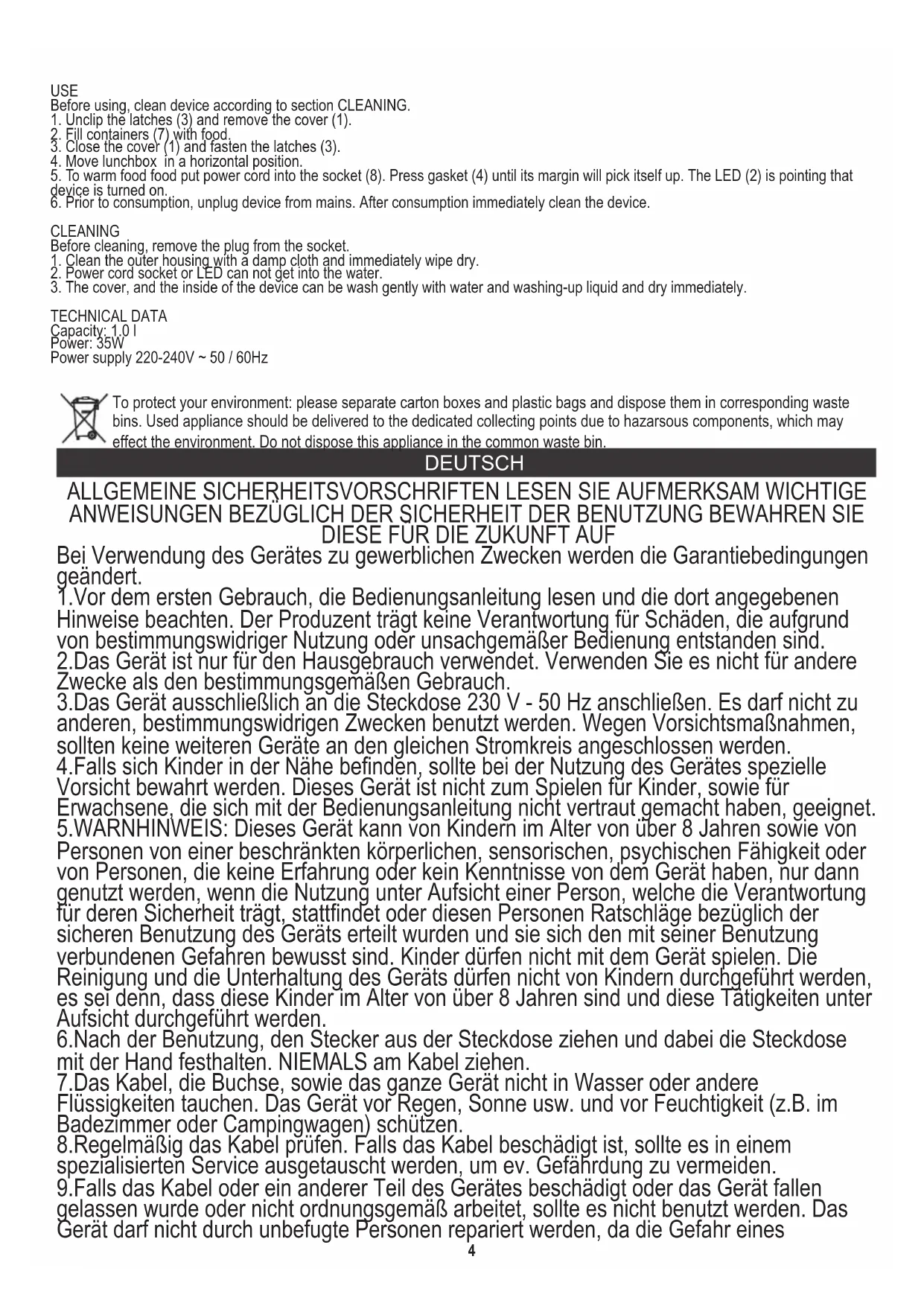 3. Den Deckel und das Innere des Gerätes vorsichtig mit Wasser und Zusatz von Spülmittel waschen und sofort trocknen lassen. TECHNISCHE DATEN Volumen: 1,0 l Leistung: 35W Versorgung: 220-240V~50Hz Den Pappkarton im Altpapier entsorgen. Polyäthylenbeutel (PE) in dem Behälter für Kunststoff entsorgen. Das abgenutzte Gerät zum Recycling zu einer offiziellen Sammelstelle bringen, da es gefährliche Substanzen enthält, die die Umwelt gefährden können. Das Gerät sollte in einer Form abgegeben werden, die eine weitere Nutzung unmöglich macht. Wenn es Batterien enthält, sollten diese rausgenommen und separat an einer Sammelstelle abgegeben werden. Das Gerät darf nicht in den Hausmüll rausgeworfen werden!! FRANÇAIS CONSIGNES DE SECURITE. INSTRUCTIONS IMPORTANTES CONCERNANT LA SECURITE D'UTILISATION.