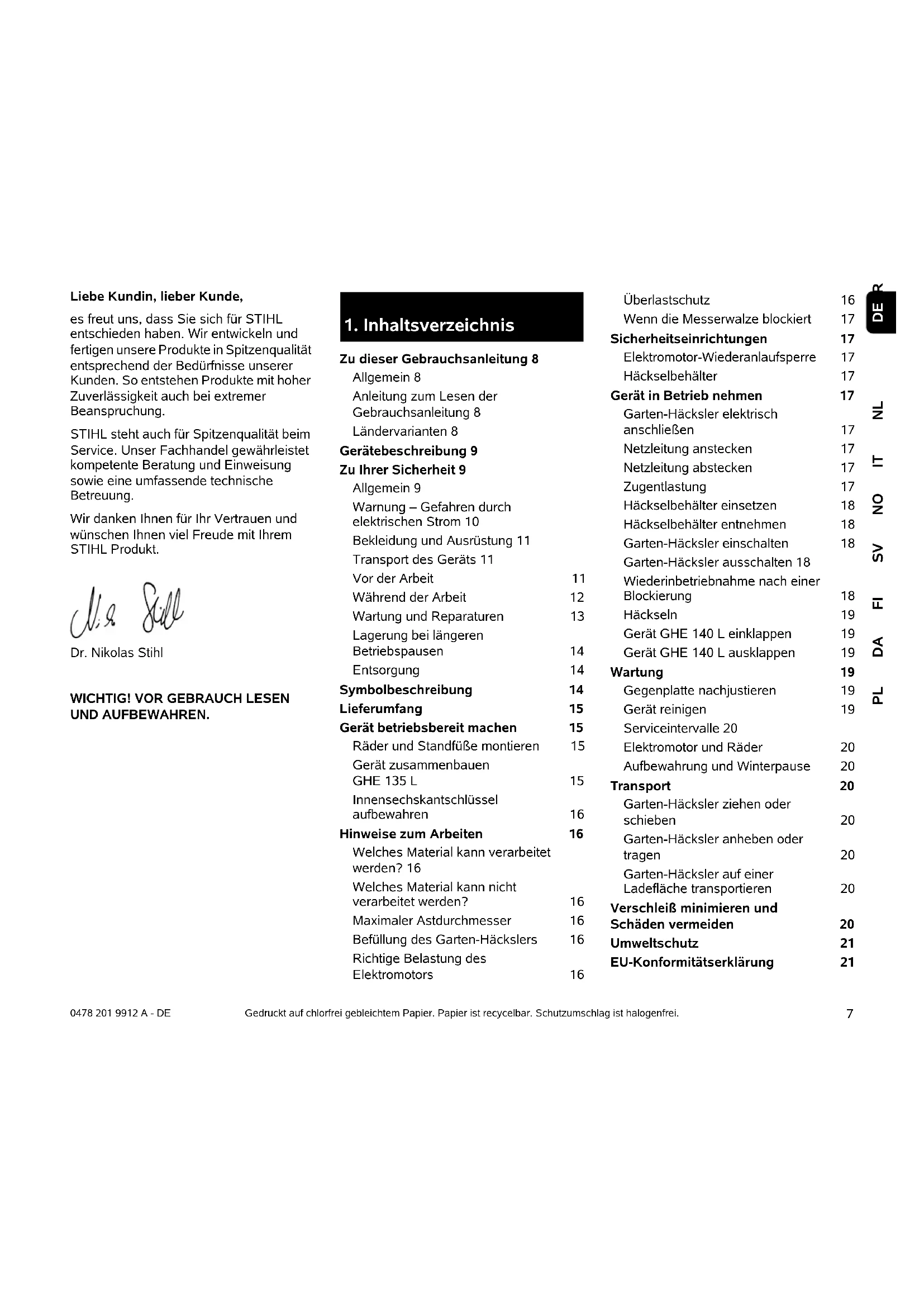 Zu dieser Gebrauchsanleitung 8 Allgemein 8 Anleitung zum Lesen der Gebrauchsanleitung 8 Ländervarianten 8 Gerätebeschreibung 9 Zu Ihrer Sicherheit 9 Allgemein 9 Warnung – Gefahren durch elektrischen Strom 10 Bekleidung und Ausrüstung 11 Transport des Geräts 11 Vor der Arbeit 11 Während der Arbeit 12 Wartung und Reparaturen 13 Lagerung bei längeren Betriebspausen 14 Entsorgung 14 Symbolbeschreibung 14 Lieferumfang 15 Gerät betriebsbereit machen 15 Räder und Standfüße montieren 15 Gerät zusammenbauen GHE 135 L 15 Innensechskantschlüssel aufbewahren 16 Hinweise zum Arbeiten 16 Welches Material kann verarbeitet werden? 16 Welches Material kann nicht verarbeitet werden? 16 Maximaler Astdurchmesser 16 Befüllung des Garten-Häckslers 16 Richtige Belastung des Elektromotors 16 Überlastschutz 16 Wenn die Messerwalze blockiert 17 Sicherheitseinrichtungen 17 Elektromotor-Wiederanlaufsperre 17 Häckselbehälter 17 Gerät in Betrieb nehmen 17 Garten-Häcksler elektrisch anschließen 17 Netzleitung anstecken 17 Netzleitung abstecken 17 Zugentlastung 17 Häckselbehälter einsetzen 18 Häckselbehälter entnehmen 18 Garten-Häcksler einschalten 18 Garten-Häcksler ausschalten 18 Wiederinbetriebnahme nach einer Blockierung 18 Häckseln 19 Gerät GHE 140 L einklappen 19 Gerät GHE 140 L ausklappen 19 Wartung 19 Gegenplatte nachjustieren 19 Gerät reinigen 19 Serviceintervalle 20 Elektromotor und Räder 20 Aufbewahrung und Winterpause 20 Transport 20 Garten-Häcksler ziehen oder schieben 20 Garten-Häcksler anheben oder tragen 20 Garten-Häcksler auf einer Ladefläche transportieren 20 Verschleiß minimieren und Schäden vermeiden 20 Umweltschutz 21 EU-Konformitätserklärung 210478 201 9912 A - DE