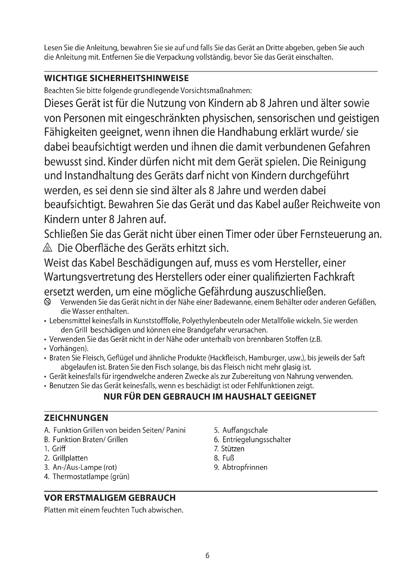 - Benutzen Sie das Gerät keinesfalls, wenn es beschädigt ist oder Fehlfunktionen zeigt. NUR FÜR DEN GEBRAUCH IM HAUSHALT GEEIGNET ZEICHNUNGEN A. Funktion Grillen von beiden Seiten/ Panini B. Funktion Braten/ Grillen