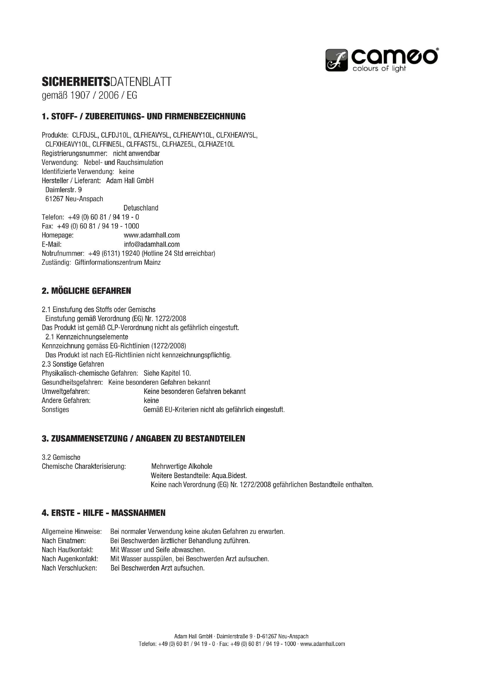 Produkte: CLFDJ5L, CLFDJ10L, CLFHEAVY5L, CLFHEAVY10L, CLFXHEAVY5L, CLFXHEAVY10L, CLFFINE5L, CLFFAST5L, CLFHAZE5L, CLFHAZE10L Registrierungsnummer: nicht anwendbar Verwendung: Nebel- und Rauchsimulation Identifizierte Verwendung: keine Hersteller / Lieferant: Adam Hall GmbH Daimlerstr. 9 61267 Neu-Anspach Detuschland Telefon: +49 (0) 60 81 / 94 19 - 0 Fax: +49 (0) 60 81 / 94 19 - 1000 Homepage: www.adamhall.com E-Mail: info@adamhall.com Notrufnummer: +49 (6131) 19240 (Hotline 24 Std erreichbar) Zuständig: Giftinformationszentrum Mainz