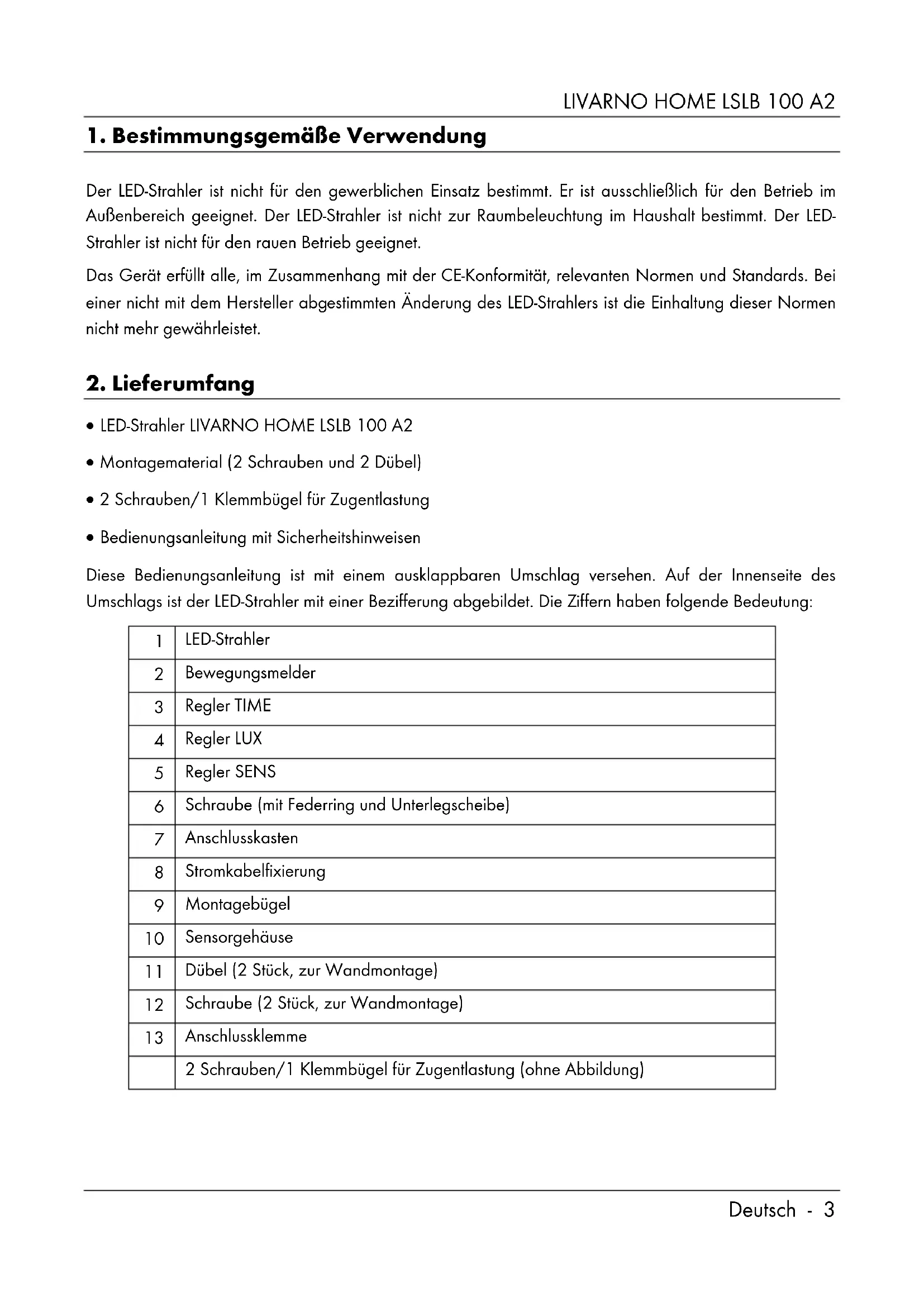 Herzlichen Glückwunsch! Mit dem Kauf des LED-Außenstrahlers 100 Watt LIVARNO HOME LSLB 100 A2, im Folgenden als LED- Strahler bezeichnet, haben Sie sich für ein hochwertiges Produkt entschieden. Die Bedienungsanleitung ist Bestandteil dieses Produkts. Sie enthält wichtige Hinweise für Sicherheit, Gebrauch und Entsorgung. Machen Sie sich vor der Benutzung des Produkts mit allen Bedien- und Sicherheitshinweisen vertraut. Benutzen Sie das Produkt nur wie beschrieben und für die angegebenen Einsatzbereiche. Händigen Sie alle Unterlagen bei Weitergabe des Produkts an Dritte mit aus.LIVARNO HOME LSLB 100 A2 Deutsch - 3