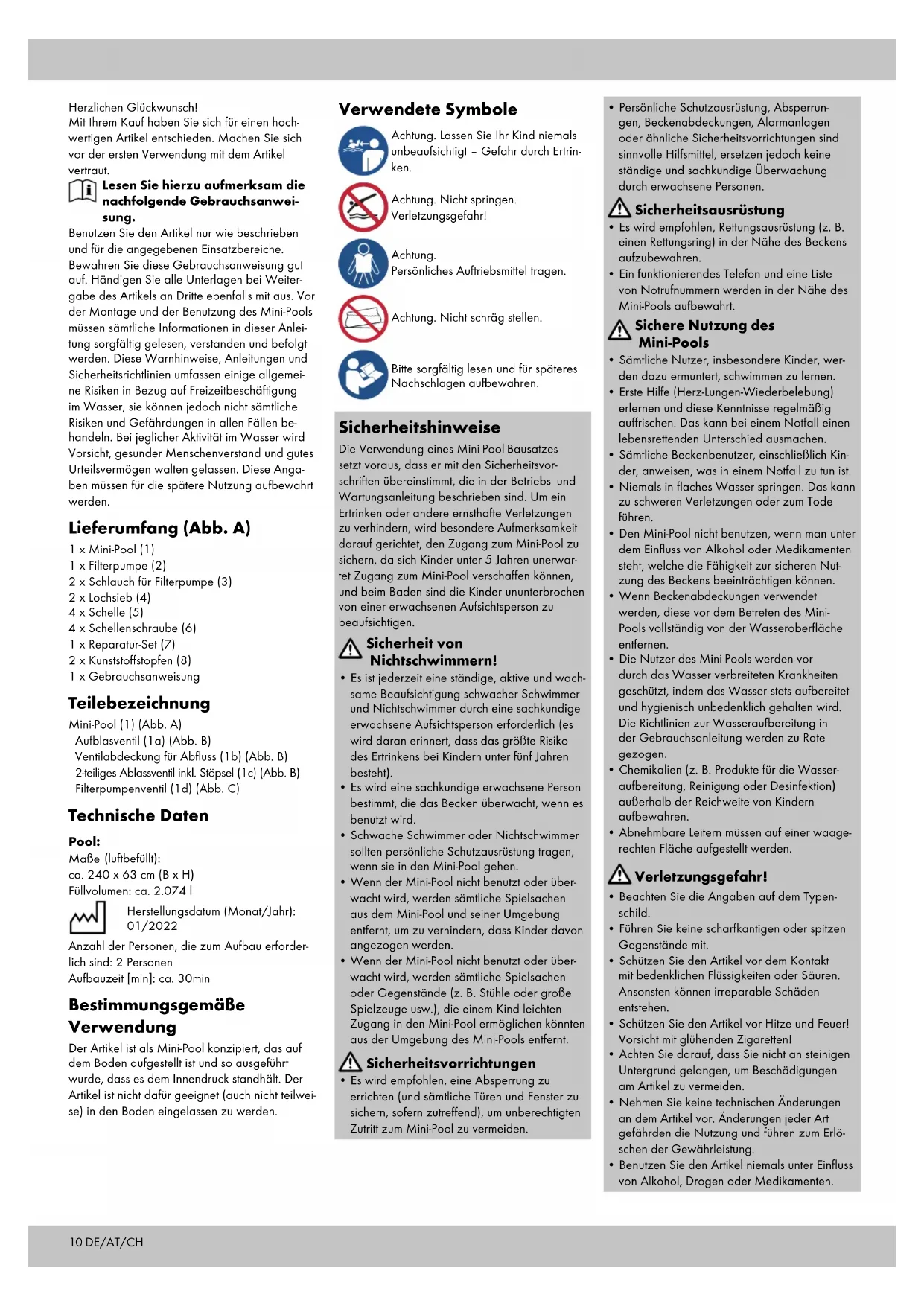 - Den Mini-Pool nicht benutzen, wenn man unter dem Einfluss von Alkohol oder Medikamenten steht, welche die Fähigkeit zur sicheren Nut- zung des Beckens beeinträchtigen können.