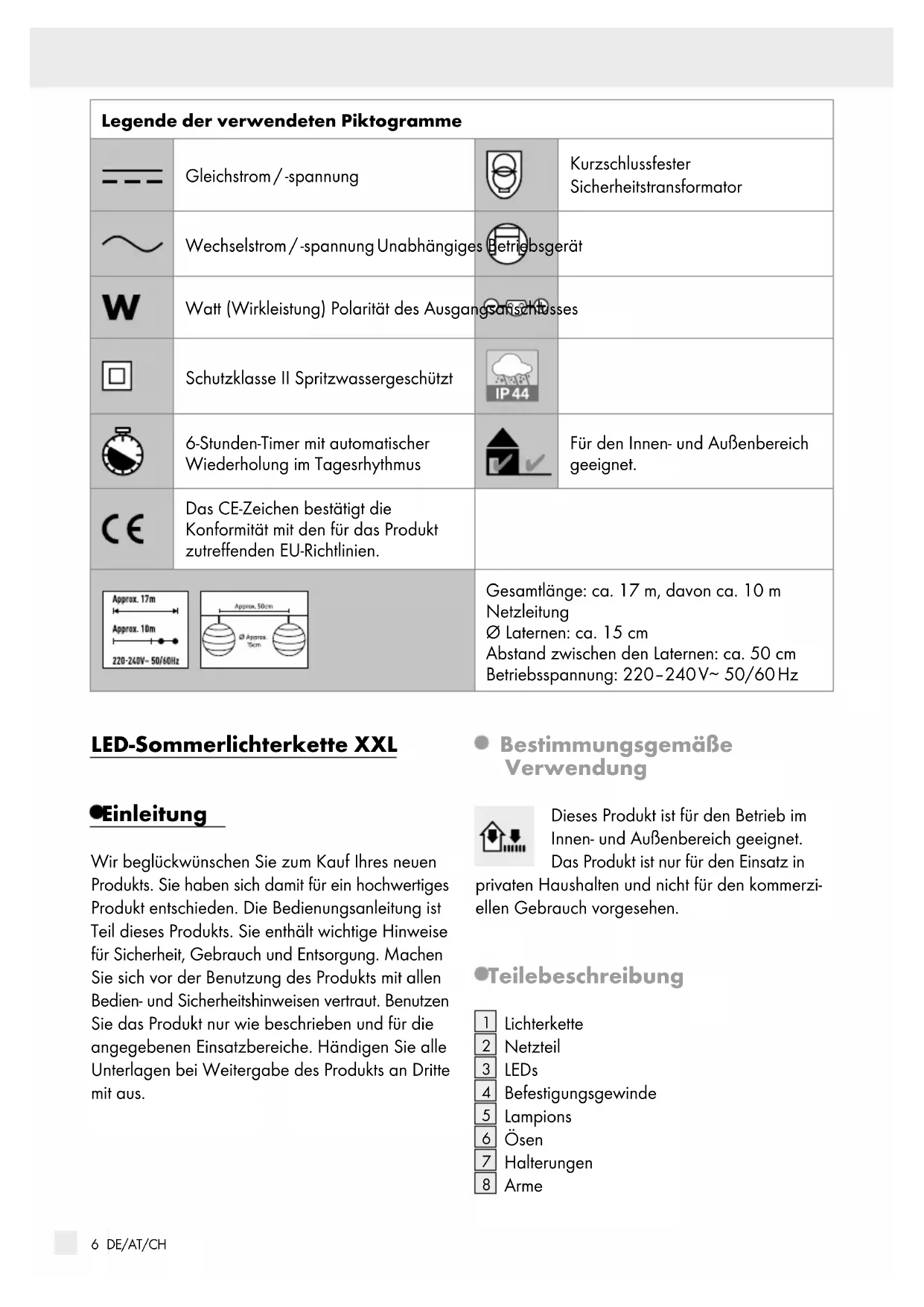 85 DE/AT/CH Legende der verwendeten Piktogramme ....................................................... Seite 6 Einleitung .....................................................................................................................................Seite 6 Bestimmungsgemäße Verwendung ................................................................................................Seite 6 Teilebeschreibung ...........................................................................................................................Seite 6 Technische Daten ............................................................................................................................Seite 7 Lieferumfang ....................................................................................................................................Seite 7 Sicherheitshinweise ............................................................................................................ Seite 7 Lampion montieren ............................................................................................................Seite 8 Anwendung ..............................................................................................................................Seite 8 Timerfunktion ...................................................................................................................................Seite 8 Reinigung und Pflege ........................................................................................................ Seite 9 Entsorgung .................................................................................................................................Seite 9 Garantie .......................................................................................................................................Seite 9 Abwicklung im Garantiefall ............................................................................................................ Seite 10 Service .............................................................................................................................................Seite 10 V3.06 DE/AT/CH Legende der verwendeten Piktogramme Gleichstrom / -spannung Kurzschlussfester Sicherheitstransformator Wechselstrom / -spannung Unabhängiges Betriebsgerät Watt (Wirkleistung) Polarität des Ausgangsanschlusses Schutzklasse II Spritzwassergeschützt 6-Stunden-Timer mit automatischer Wiederholung im Tagesrhythmus Für den Innen- und Außenbereich geeignet. Das CE-Zeichen bestätigt die Konformität mit den für das Produkt zutreffenden EU-Richtlinien. Gesamtlänge: ca. 17 m, davon ca. 10 m Netzleitung Ø Laternen: ca. 15 cm Abstand zwischen den Laternen: ca. 50 cm Betriebsspannung: 220‒240 V∼ 50/60 Hz LED-Sommerlichterkette XXL Einleitung Wir beglückwünschen Sie zum Kauf Ihres neuen Produkts. Sie haben sich damit für ein hochwertiges Produkt entschieden. Die Bedienungsanleitung ist Teil dieses Produkts. Sie enthält wichtige Hinweise für Sicherheit, Gebrauch und Entsorgung. Machen Sie sich vor der Benutzung des Produkts mit allen Bedien- und Sicherheitshinweisen vertraut. Benutzen Sie das Produkt nur wie beschrieben und für die angegebenen Einsatzbereiche. Händigen Sie alle Unterlagen bei Weitergabe des Produkts an Dritte mit aus. Bestimmungsgemäße Verwendung Dieses Produkt ist für den Betrieb im Innen- und Außenbereich geeignet. Das Produkt ist nur für den Einsatz in privaten Haushalten und nicht für den kommerzi- ellen Gebrauch vorgesehen. Teilebeschreibung