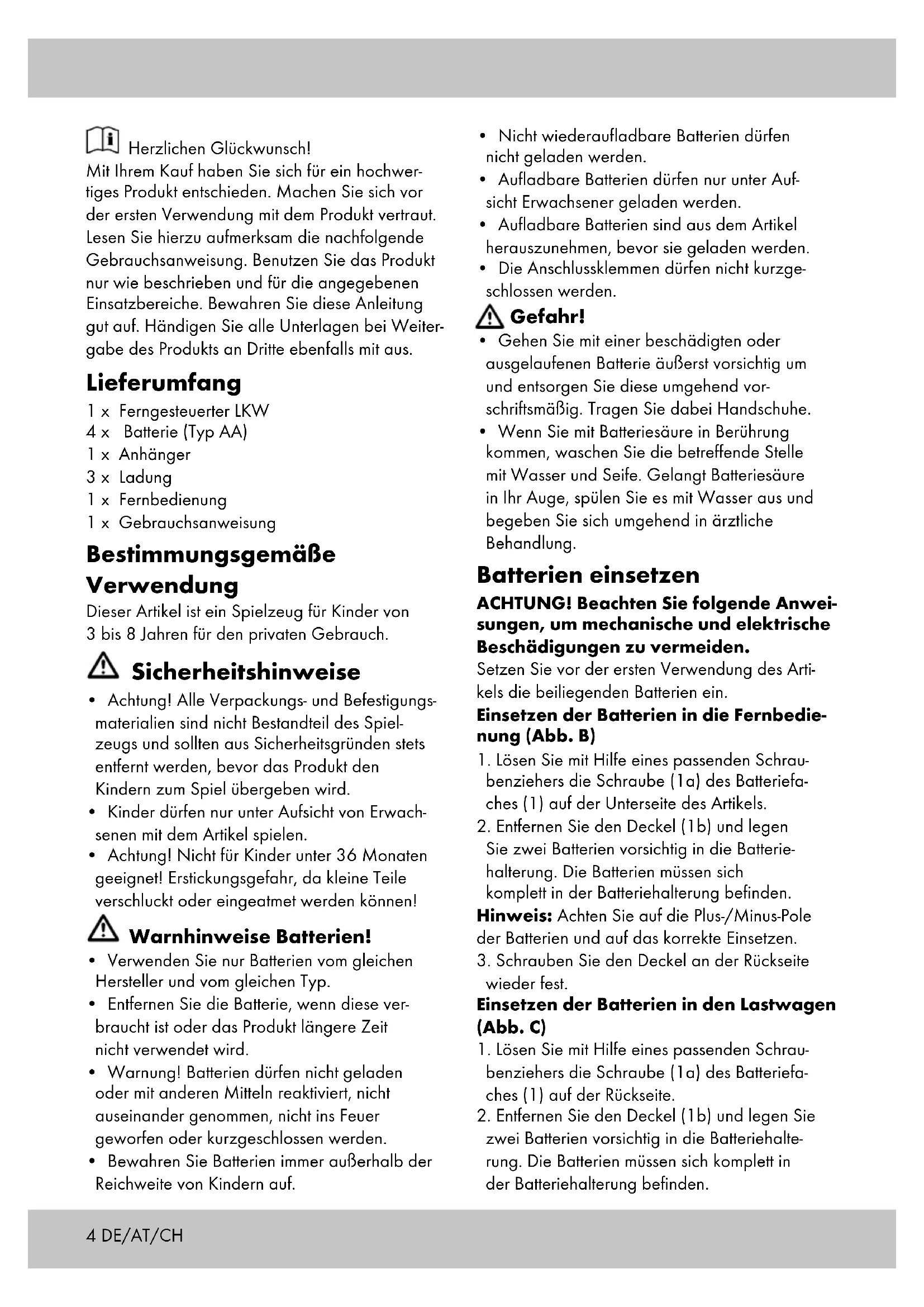 A B OFF E34 DE/AT/CH Herzlichen Glückwunsch! Mit Ihrem Kauf haben Sie sich für ein hochwer- tiges Produkt entschieden. Machen Sie sich vor der ersten Verwendung mit dem Produkt vertraut. Lesen Sie hierzu aufmerksam die nachfolgende Gebrauchsanweisung. Benutzen Sie das Produkt nur wie beschrieben und für die angegebenen Einsatzbereiche. Bewahren Sie diese Anleitung gut auf. Händigen Sie alle Unterlagen bei Weiter- gabe des Produkts an Dritte ebenfalls mit aus. Lieferumfang 1 x Ferngesteuerter LKW 4 x Batterie (Typ AA) 1 x Anhänger 3 x Ladung 1 x Fernbedienung 1 x Gebrauchsanweisung Bestimmungsgemäße Verwendung Dieser Artikel ist ein Spielzeug für Kinder von 3 bis 8 Jahren für den privaten Gebrauch. Sicherheitshinweise
