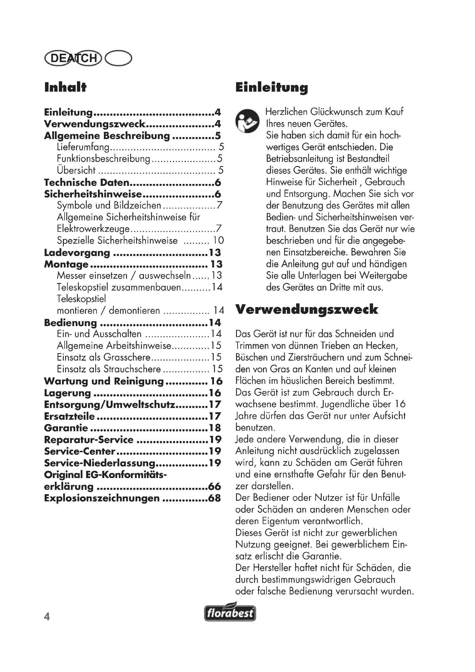 Das Gerät ist nur für das Schneiden und Trimmen von dünnen Triuben an Hecken, Büschen und Ziersträuchern und zum Schneiden von Gras an Kanten und auf keinen Flächen im hauslichen Bereich bestimmt. Das Gerät ist zum Gebrauch durch Erwachsene bestimmt. Jugendliche über 16 Jahre dürfen das Gerät nur unter Aufsicht benutzen.