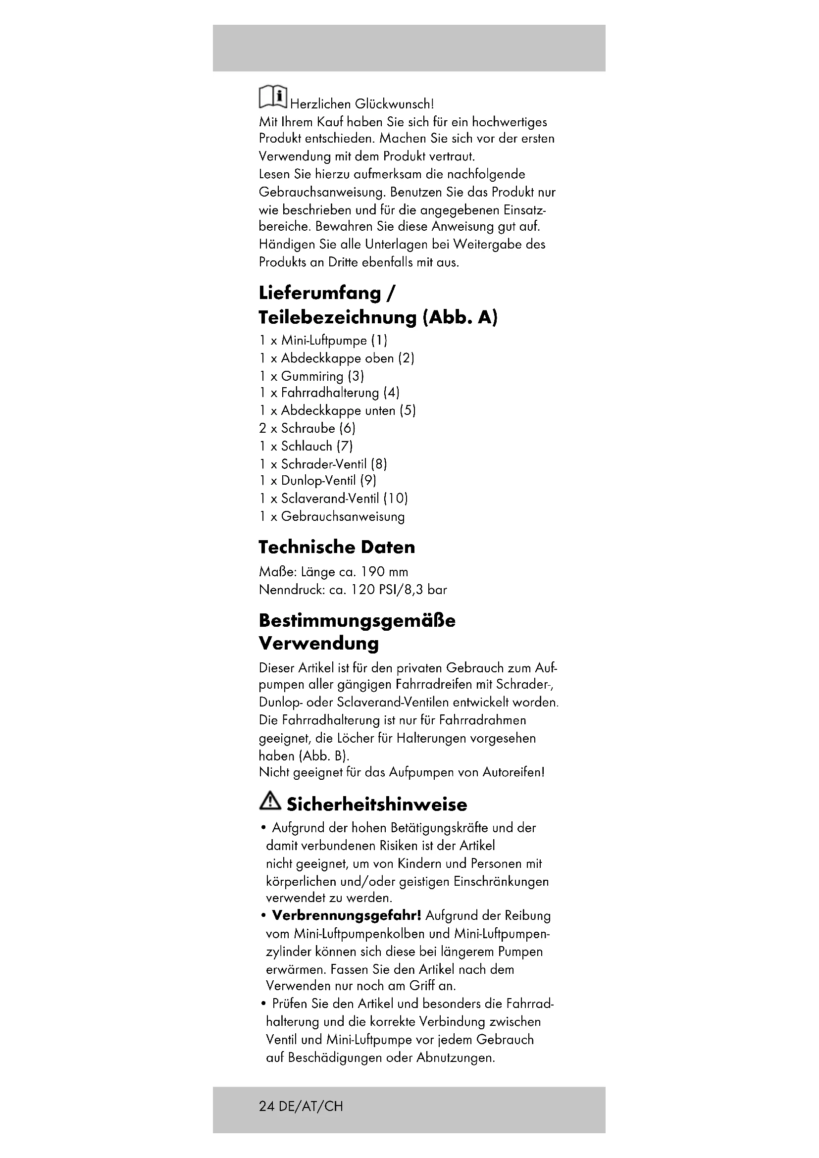 - Verbrennungsgefahr! Aufgrund der Reibung vom Mini-Luftpumpenkolben und Mini-Luftpumpen- zylinder können sich diese bei längerem Pumpen erwärmen. Fassen Sie den Artikel nach dem Verwenden nur noch am Griff an.