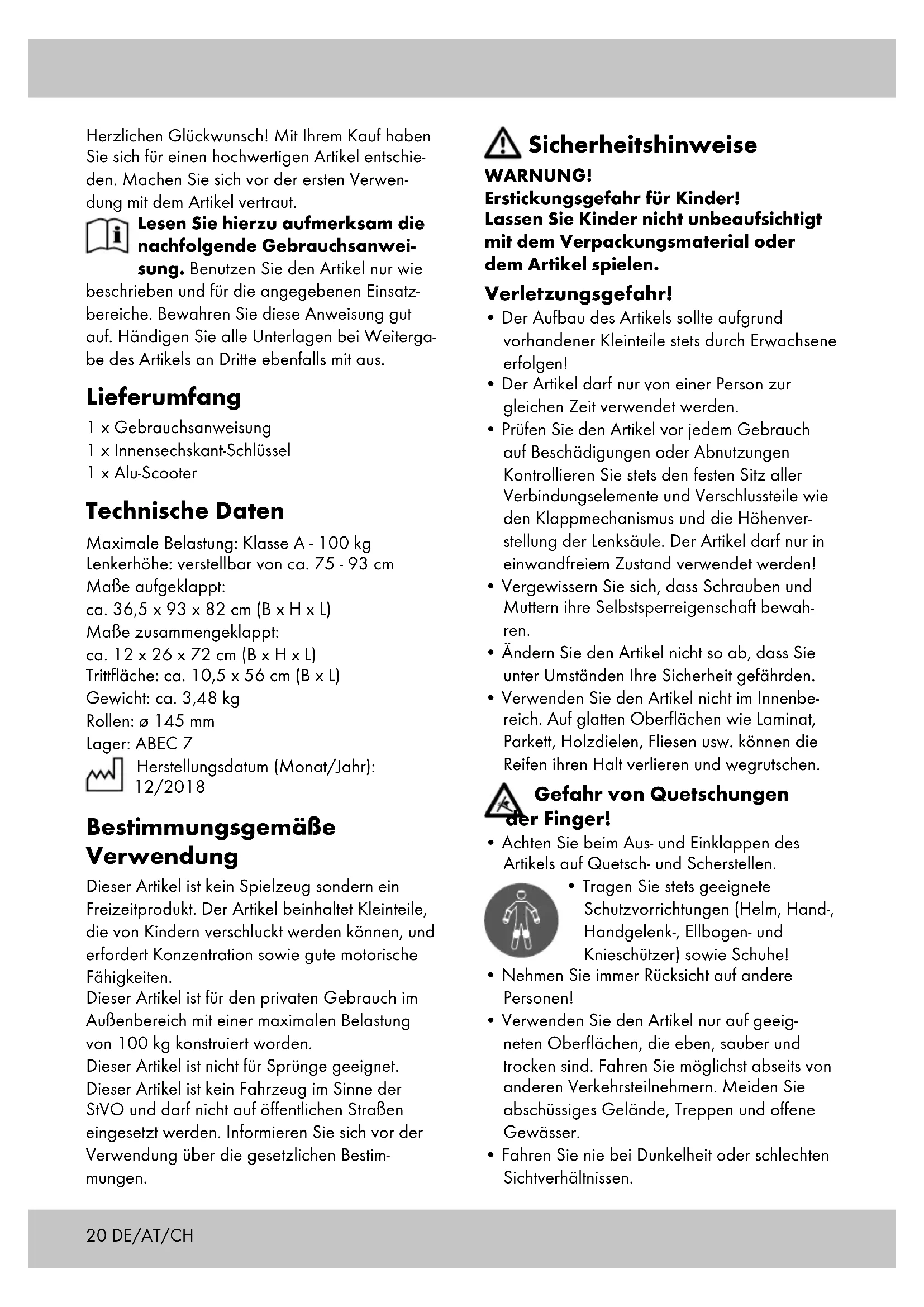 de asschroeven (17). Na het verwisselen: Als na het verwisselen een wieltje schuurt, niet gebruiken! Verzeker u ervan dat na het eerste gebruik alle schroeven nog vastzitten en er niets losgeraakt of versoepeld is. Span de wieltjes nog eenmaal op om u ervan te verzekeren dat ze normaal draaien en dat het lager geen geluid maakt.19 Opmerkingen over garantie en serviceafhandeling Het product is geproduceerd met grote zorg en onder voortdurende controle. U ontvangt een garantie van drie jaar op dit product, vanaf de datum van aankoop. Bewaar alstublieft uw aankoopbewijs. De garantie geldt alleen voor materiaal- en fa- bricagefouten en vervalt bij foutief of oneigenlijk gebruik. Uw wettelijke rechten, met name het garantierecht, worden niet beïnvloed door deze garantie. In geval van reclamaties dient u zich aan de beneden genoemde service-hotline te wenden of zich per e-mail met ons in verbinding te zetten. Onze servicemedewerkers zullen de verdere handelswijze zo snel mogelijk met u afspreken. Wij zullen u in ieder geval persoonlijk te woord staan. De garantieperiode wordt na eventuele repa- raties en op basis van de garantie, wettelijke garantie of coulance niet verlengd. Dit geldt ook voor vervangen en gerepareerde delen. Na afloop van de garantieperiode dienen even- tuele reparaties te worden betaald. IAN: 307525 Service België Tel.: 070 270 171 (0,15 EUR/Min.) E-Mail: deltasport@lidl.be Service Nederland Tel.: 0900 0400223 (0,10 EUR/Min.) E-Mail: deltasport@lidl.nl NL/BE20 DE/AT/CH Herzlichen Glückwunsch! Mit Ihrem Kauf haben Sie sich für einen hochwertigen Artikel entschie- den. Machen Sie sich vor der ersten Verwen- dung mit dem Artikel vertraut. Lesen Sie hierzu aufmerksam die nachfolgende Gebrauchsanwei- sung. Benutzen Sie den Artikel nur wie beschrieben und für die angegebenen Einsatz- bereiche. Bewahren Sie diese Anweisung gut auf. Händigen Sie alle Unterlagen bei Weiterga- be des Artikels an Dritte ebenfalls mit aus. Lieferumfang 1 x Gebrauchsanweisung 1 x Innensechskant-Schlüssel 1 x Alu-Scooter Technische Daten Maximale Belastung: Klasse A - 100 kg Lenkerhöhe: verstellbar von ca. 75 - 93 cm Maße aufgeklappt: ca. 36,5 x 93 x 82 cm (B x H x L) Maße zusammengeklappt: ca. 12 x 26 x 72 cm (B x H x L) Trittfläche: ca. 10,5 x 56 cm (B x L) Gewicht: ca. 3,48 kg Rollen: ø 145 mm Lager: ABEC 7 Herstellungsdatum (Monat/Jahr): 12/2018 Bestimmungsgemäße Verwendung Dieser Artikel ist kein Spielzeug sondern ein Freizeitprodukt. Der Artikel beinhaltet Kleinteile, die von Kindern verschluckt werden können, und erfordert Konzentration sowie gute motorische Fähigkeiten. Dieser Artikel ist für den privaten Gebrauch im Außenbereich mit einer maximalen Belastung von 100 kg konstruiert worden. Dieser Artikel ist nicht für Sprünge geeignet. Dieser Artikel ist kein Fahrzeug im Sinne der StVO und darf nicht auf öffentlichen Straßen eingesetzt werden. Informieren Sie sich vor der Verwendung über die gesetzlichen Bestim- mungen. Sicherheitshinweise WARNUNG! Erstickungsgefahr für Kinder! Lassen Sie Kinder nicht unbeaufsichtigt mit dem Verpackungsmaterial oder dem Artikel spielen. Verletzungsgefahr!