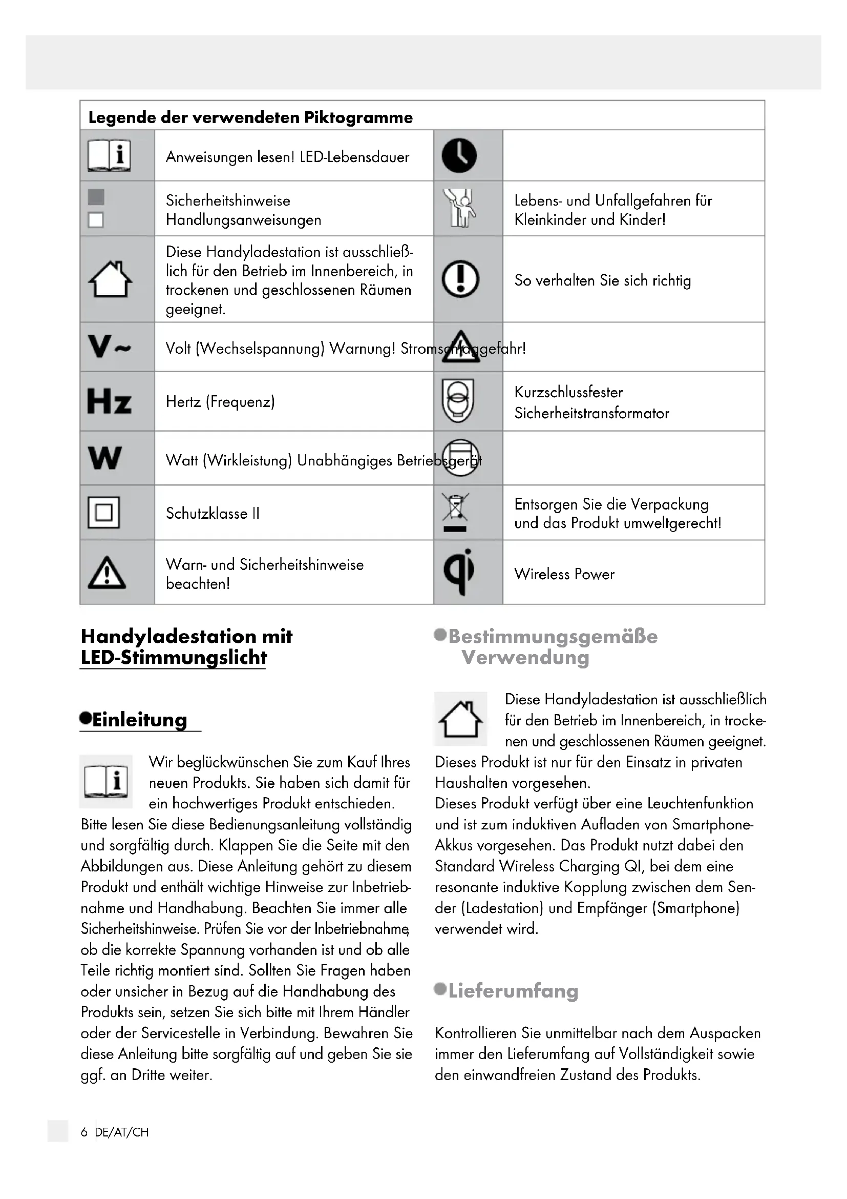 85 DE/AT/CH Inhaltsverzeichnis Legende der verwendeten Piktogramme ...........................................................Seite 6 Einleitung ......................................................................................................................................... Seite 6 Bestimmungsgemäße Verwendung ....................................................................................................Seite 6 Lieferumfang ........................................................................................................................................ Seite 6 Teilebeschreibung ...............................................................................................................................Seite 7 Technische Daten ................................................................................................................................Seite 7 Sicherheit ......................................................................................................................................... Seite 7 Sicherheitshinweise .............................................................................................................................Seite 7 Inbetriebnahme ......................................................................................................................... Seite 8 Stimmungslicht dimmen .......................................................................................................................Seite 8 RGB-Farben bestimmen ......................................................................................................................Seite 8 Akku Ihres Smartphone aufladen .......................................................................................................Seite 8 Handyhülle verwenden .......................................................................................................................Seite 9 Wartung und Reinigung .....................................................................................................Seite 9 Entsorgung .....................................................................................................................................Seite 9 Konformitätserklärung .......................................................................................................Seite 9 Garantie und Service ............................................................................................................Seite 9 Garantie ..............................................................................................................................................Seite 9 Serviceadresse ....................................................................................................................................Seite 10 Garantiekarte ......................................................................................................................................Seite 106 DE/AT/CH Einleitung / SicherheitEinleitung Legende der verwendeten Piktogramme Anweisungen lesen! LED-Lebensdauer Sicherheitshinweise Handlungsanweisungen Lebens- und Unfallgefahren für Kleinkinder und Kinder! Diese Handyladestation ist ausschließ- lich für den Betrieb im Innenbereich, in trockenen und geschlossenen Räumen geeignet. So verhalten Sie sich richtig Volt (Wechselspannung) Warnung! Stromschlaggefahr! Hertz (Frequenz) Kurzschlussfester Sicherheitstrans formator Watt (Wirkleistung) Unabhängiges Betriebsgerät Schutzklasse II Entsorgen Sie die Verpackung und das Produkt umweltgerecht! Warn- und Sicherheitshinweise beachten! Wireless Power Handyladestation mit LED-Stimmungslicht Einleitung Wir beglückwünschen Sie zum Kauf Ihres neuen Produkts. Sie haben sich damit für ein hochwertiges Produkt entschieden. Bitte lesen Sie diese Bedienungsanleitung vollständig und sorgfältig durch. Klappen Sie die Seite mit den Abbildungen aus. Diese Anleitung gehört zu diesem Produkt und enthält wichtige Hinweise zur Inbetrieb- nahme und Handhabung. Beachten Sie immer alle Sicherheitshinweise. Prüfen Sie vor der Inbetriebnahme