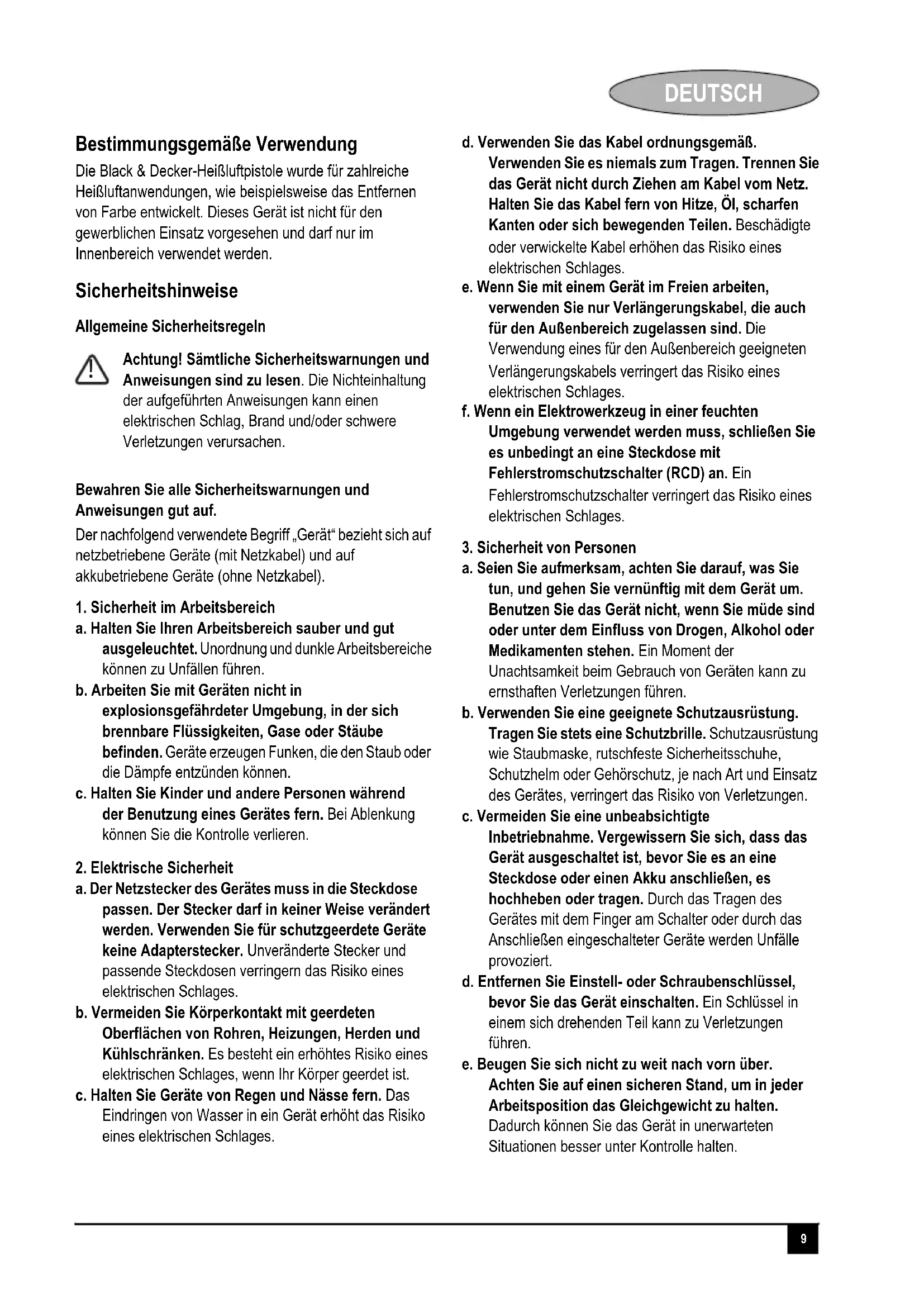 a. Lassen Sie das Gerät nur von qualifiziertem Fachpersonal und nur mit Originalersatzteilen reparieren. Damit wird gewährleistet, dass die Sicherheit des Gerätes erhalten bleibt. Zusätzliche Sicherheitshinweise Achtung! Das Gerät ist ausschließlich für die Verwendung im Innenbereich geeignet. Achtung! Dieses Gerät darf nicht von Personen (einschließlich Kindern) mit eingeschränkten körperlichen, sensorischen oder geistigen Fähigkeiten sowie mangelnder Erfahrung oder mangelndem Wissen in Bezug auf dessen Gebrauch bedient werden, es sei denn, sie werden bei der Verwendung des Geräts von einer erfahrenen Person beaufsichtigt oder angeleitet. Achtung! Kinder müssen beaufsichtigt werden, um sicherzustellen, dass sie nicht mit dem Gerät spielen. Achtung! Wenn das Gerät nicht benutzt wird, muss es auf dem vorgesehenen Ständer abgestellt werden. Achtung! Wenn das Gerät nicht mit Sorgfalt verwendet wird, kann es einen Brand auslösen. Verwenden Sie das Gerät nur mit äußerster Vorsicht an Orten mit brennbaren Materialien; X Halten Sie die heiße Luft nicht für längere Zeit an dieselbe Stelle gerichtet; X Verwenden Sie das Gerät nicht in explosionsgefährdeter Umgebung; X Denken Sie daran, dass die Hitze zu brennbaren Materialien weitergeleitet werden kann, die sich nicht in Sichtweite befinden; X Stellen Sie das Gerät nach Gebrauch auf seinen Ständer, und lassen Sie es vor der Aufbewahrung abkühlen. X Lassen Sie das eingeschaltete Gerät niemals unbeaufsichtigt. X Verdecken Sie nicht die Lufteinlassschlitze oder das Abluftventil, da dies zu einem Heißluftstau und in der Folge zu Schäden am Gerät führen kann. X Richten Sie den Heißluftstrom nicht auf andere Personen oder Tiere. X Berühren Sie nicht die Düse. Diese wird während des Betriebs sehr heiß und bleibt auch nach dem Betrieb noch bis zu 30 Minuten heiß. X Die Düse darf während des Betriebs oder nach Betrieb keine Gegenstände berühren. X Stecken Sie nichts in die Düse, da Sie einen elektrischen Schlag bekommen könnten. Achtung! Zusätzliche Sicherheitshinweise für Heißluftpistolen. !11 DEUTSCH X Schauen Sie nicht in die Düse, wenn das Gerät eingeschaltet ist. X Verwenden Sie das Gerät nicht als Haartrockner! Die Lufttemperatur ist sehr viel höher, als die eines Haartrockners. X Achten Sie während des Betriebs auf gute Belüftung, da giftige Dämpfe entstehen könnten. X Betreiben Sie das Gerät nie in feuchter Umgebung. X Entfernen Sie Farbe nur in einem geschlossenen Arbeitsbereich. Tragen Sie eine speziell für den Schutz vor Staub und Dämpfen von bleihaltiger Farbe vorgesehene Staubmaske, und stellen Sie sicher, dass auch andere Personen geschützt sind, die den Arbeitsplatz betreten oder sich dort aufhalten. X Verbrennen Sie nicht Farben, da dies zu Brandgefahr führen kann. X Achten Sie darauf, dass keine Farbe an der Düse kleben bleibt, da sie sich nach einiger Zeit entzünden könnte. X Schalten Sie das Gerät aus, und lassen Sie es abkühlen, bevor Sie Zubehör anbringen. Entfernen von bleihaltiger Farbe X Beim Entfernen von Farbe ist höchste Vorsicht geboten. Farbsplitter, -überreste und -dämpfe können giftiges Blei enthalten. Gebäude, die vor 1960 erbaut wurden, wurden möglicherweise mit bleihaltiger Farbe gestrichen. Auf dieser Farbe könnten sich weitere Farbschichten befinden. Bei Ablagerung auf Oberflächen kann der Kontakt von den Händen zum Mund zur Aufnahme von Blei führen. X Belastungen durch selbst niedrige Bleiwerte können irreversible Schäden in Gehirn und im Nervensystem hervorrufen. Am gefährlichsten sind Bleivergiftungen bei Kindern und Schwangeren. X Bevor Sie mit dem Arbeitsvorgang beginnen, muss festgestellt werden, ob die zu entfernende Farbe Blei enthält. Dies kann mithilfe eines Testsatzes oder durch einen professionellen Malermeister festgestellt werden. Rauchen, trinken oder essen Sie nicht in einem Arbeitsbereich, der möglicherweise bleiverseucht ist. Farben auf Bleibasis sollten nur von einem Fachmann entfernt werden und nicht mithilfe einer Heißluftpistole. Warnsymbole Elektrische Sicherheit X Ist das Netzkabel beschädigt, muss es durch den Hersteller oder eine Black & Decker Vertragswerkstatt ausgetauscht werden, um eine mögliche Gefährdung zu vermeiden. Verlängerungskabel X Ein zwei- oder dreiadriges Kabel kann verwendet werden, da das Gerät schutzisoliert ist und es sich um ein Produkt der Klasse 2 handelt. X Bis 30 m Kabellänge treten keine Leistungsverluste auf. Merkmale