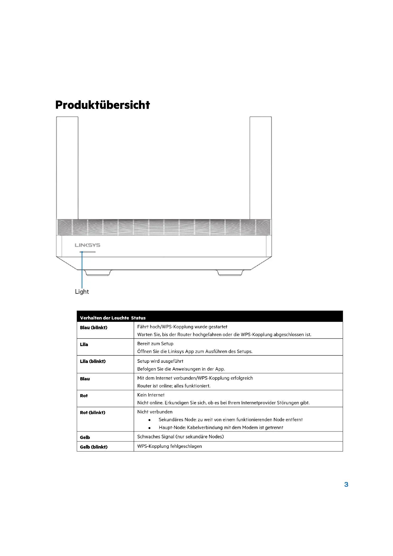 | Blau (blinkt) | Fährt hoch/WPS-Kopplung wurde gestartetWarten Sie, bis der Router hochgefahren oder die WPS-Kopplung abgeschlossen ist. |
