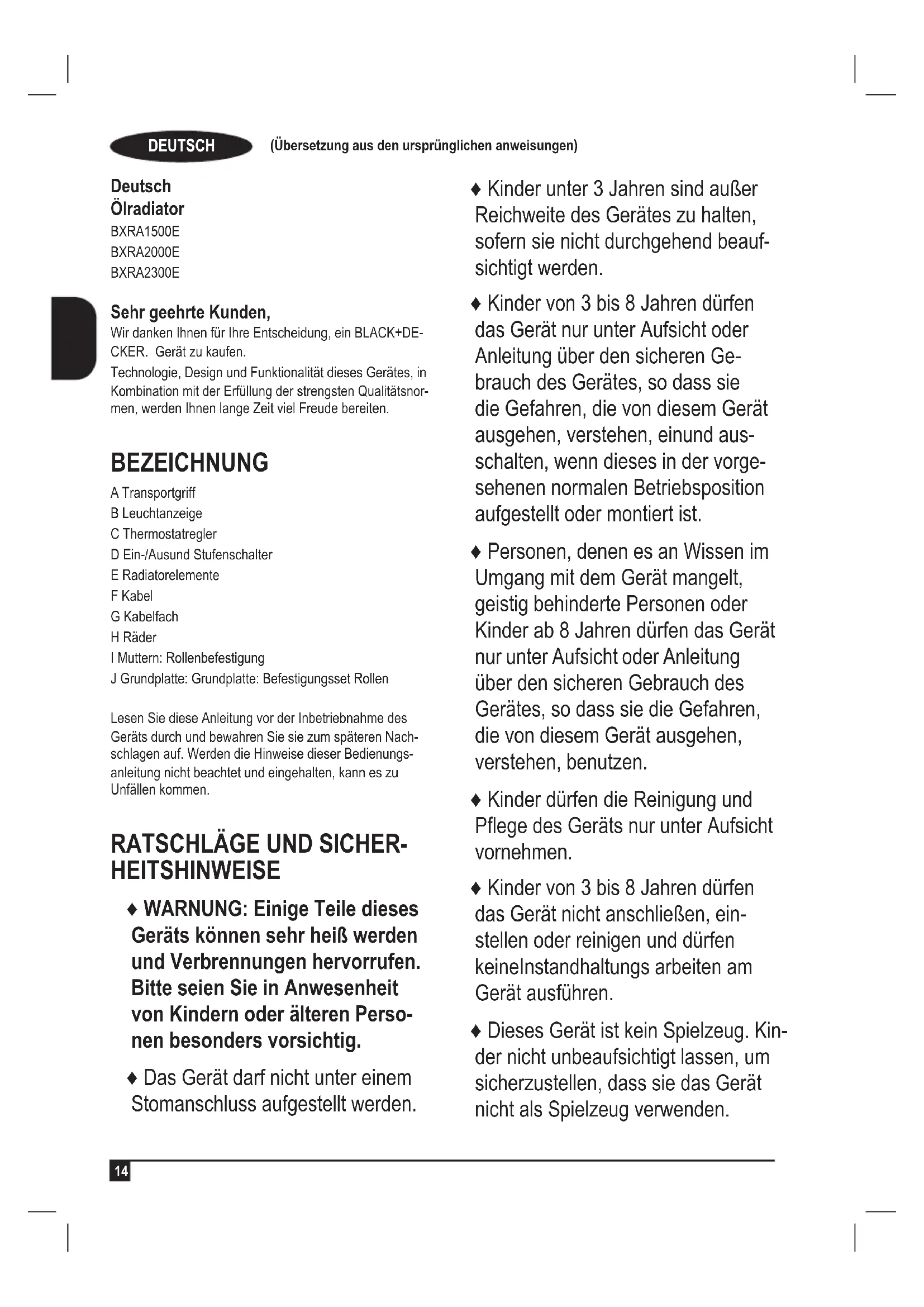 Deutsch Ölradiator BXRA1500E BXRA2000E BXRA2300E Sehr geehrte Kunden, Wir danken Ihnen für Ihre Entscheidung, ein BLACK+DE- CKER. Gerät zu kaufen. Technologie, Design und Funktionalität dieses Gerätes, in Kombination mit der Erfüllung der strengsten Qualitätsnor- men, werden Ihnen lange Zeit viel Freude bereiten. BEZEICHNUNG A Transportgriff B Leuchtanzeige C Thermostatregler D Ein-/Ausund Stufenschalter E Radiatorelemente F Kabel G Kabelfach H Räder I Muttern: Rollenbefestigung J Grundplatte: Grundplatte: Befestigungsset Rollen Lesen Sie diese Anleitung vor der Inbetriebnahme des Geräts durch und bewahren Sie sie zum späteren Nach- schlagen auf. Werden die Hinweise dieser Bedienungs- anleitung nicht beachtet und eingehalten, kann es zu Unfällen kommen.