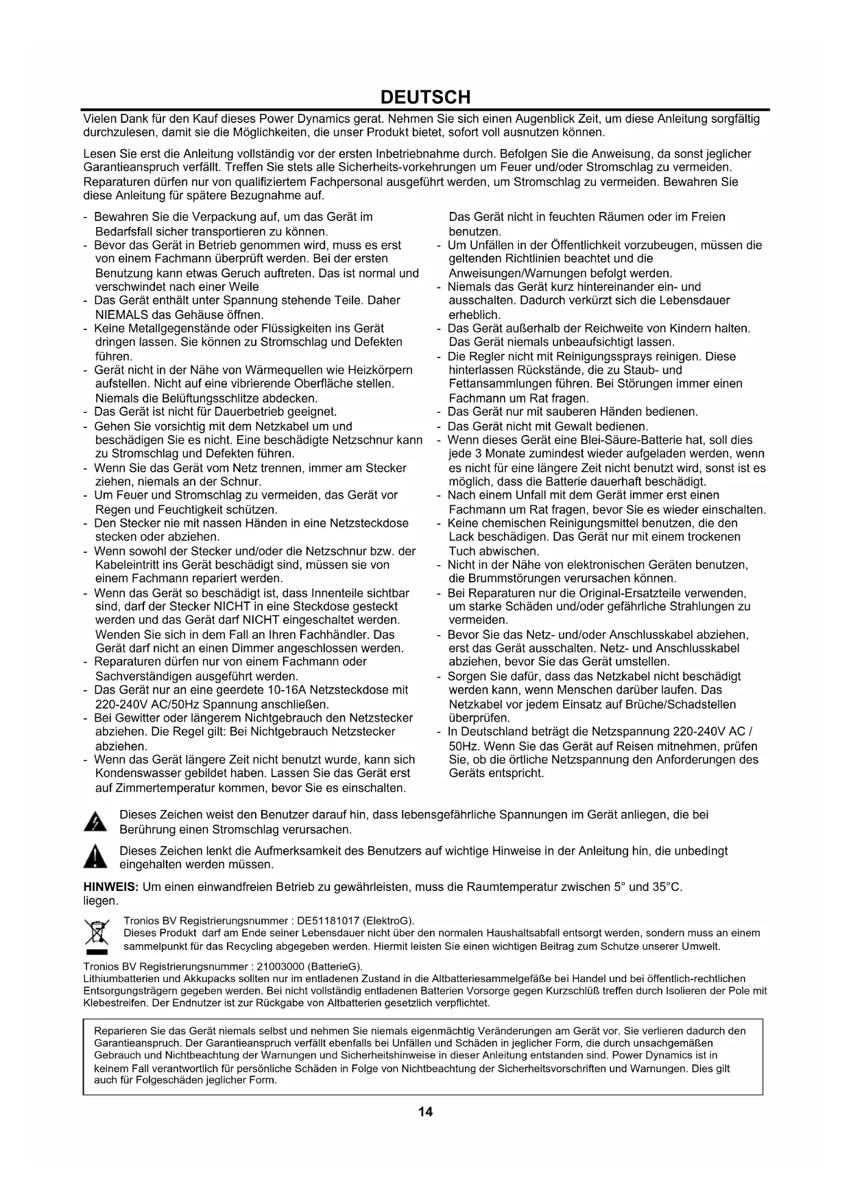 DEUTSCH Vielen Dank für den Kauf dieses Power Dynamics gerat. Nehmen Sie sich einen Augenblick Zeit, um diese Anleitung sorgfältig durchzulesen, damit sie die Möglichkeiten, die unser Produkt bietet, sofort voll ausnutzen können. Lesen Sie erst die Anleitung vollständig vor der ersten Inbetriebnahme durch. Befolgen Sie die Anweisung, da sonst jeglicher Garantieanspruch verfällt. Treffen Sie stets alle Sicherheits-vorkehrungen um Feuer und/oder Stromschlag zu vermeiden. Reparaturen dürfen nur von qualifiziertem Fachpersonal ausgeführt werden, um Stromschlag zu vermeiden. Bewahren Sie diese Anleitung für spätere Bezugnahme auf. - Bewahren Sie die Verpackung auf, um das Gerät im Bedarfsfall sicher transportieren zu können. - Bevor das Gerät in Betrieb genommen wird, muss es erst von einem Fachmann überprüft werden. Bei der ersten Benutzung kann etwas Geruch auftreten. Das ist normal und verschwindet nach einer Weile - Das Gerät enthält unter Spannung stehende Teile. Daher NIEMALS das Gehäuse öffnen. - Keine Metallgegenstände oder Flüssigkeiten ins Gerät dringen lassen. Sie können zu Stromschlag und Defekten führen. - Gerät nicht in der Nähe von Wärmequellen wie Heizkörpern aufstellen. Nicht auf eine vibrierende Oberfläche stellen. Niemals die Belüftungsschlitze abdecken. - Das Gerät ist nicht für Dauerbetrieb geeignet. - Gehen Sie vorsichtig mit dem Netzkabel um und beschädigen Sie es nicht. Eine beschädigte Netzschnur kann zu Stromschlag und Defekten führen. - Wenn Sie das Gerät vom Netz trennen, immer am Stecker ziehen, niemals an der Schnur. - Um Feuer und Stromschlag zu vermeiden, das Gerät vor Regen und Feuchtigkeit schützen. - Den Stecker nie mit nassen Händen in eine Netzsteckdose stecken oder abziehen. - Wenn sowohl der Stecker und/oder die Netzschnur bzw. der Kabeleintritt ins Gerät beschädigt sind, müssen sie von einem Fachmann repariert werden. - Wenn das Gerät so beschädigt ist, dass Innenteile sichtbar sind, darf der Stecker NICHT in eine Steckdose gesteckt werden und das Gerät darf NICHT eingeschaltet werden. Wenden Sie sich in dem Fall an Ihren Fachhändler. Das Gerät darf nicht an einen Dimmer angeschlossen werden. - Reparaturen dürfen nur von einem Fachmann oder Sachverständigen ausgeführt werden. - Das Gerät nur an eine geerdete 10-16A Netzsteckdose mit 220-240V AC/50Hz Spannung anschließen. - Bei Gewitter oder längerem Nichtgebrauch den Netzstecker abziehen. Die Regel gilt: Bei Nichtgebrauch Netzstecker abziehen. - Wenn das Gerät längere Zeit nicht benutzt wurde, kann sich Kondenswasser gebildet haben. Lassen Sie das Gerät erst auf Zimmertemperatur kommen, bevor Sie es einschalten. Das Gerät nicht in feuchten Räumen oder im Freien benutzen. - Um Unfällen in der Öffentlichkeit vorzubeugen, müssen die geltenden Richtlinien beachtet und die Anweisungen/Warnungen befolgt werden. - Niemals das Gerät kurz hintereinander ein- und ausschalten. Dadurch verkürzt sich die Lebensdauer erheblich. - Das Gerät außerhalb der Reichweite von Kindern halten. Das Gerät niemals unbeaufsichtigt lassen. - Die Regler nicht mit Reinigungssprays reinigen. Diese hinterlassen Rückstände, die zu Staub- und Fettansammlungen führen. Bei Störungen immer einen Fachmann um Rat fragen. - Das Gerät nur mit sauberen Händen bedienen. - Das Gerät nicht mit Gewalt bedienen. - Wenn dieses Gerät eine Blei-Säure-Batterie hat, soll dies jede 3 Monate zumindest wieder aufgeladen werden, wenn es nicht für eine längere Zeit nicht benutzt wird, sonst ist es möglich, dass die Batterie dauerhaft beschädigt. - Nach einem Unfall mit dem Gerät immer erst einen Fachmann um Rat fragen, bevor Sie es wieder einschalten. - Keine chemischen Reinigungsmittel benutzen, die den Lack beschädigen. Das Gerät nur mit einem trockenen Tuch abwischen. - Nicht in der Nähe von elektronischen Geräten benutzen, die Brummstörungen verursachen können. - Bei Reparaturen nur die Original-Ersatzteile verwenden, um starke Schäden und/oder gefährliche Strahlungen zu vermeiden. - Bevor Sie das Netz- und/oder Anschlusskabel abziehen, erst das Gerät ausschalten. Netz- und Anschlusskabel abziehen, bevor Sie das Gerät umstellen. - Sorgen Sie dafür, dass das Netzkabel nicht beschädigt werden kann, wenn Menschen darüber laufen. Das Netzkabel vor jedem Einsatz auf Brüche/Schadstellen überprüfen. - In Deutschland beträgt die Netzspannung 220-240V AC / 50Hz. Wenn Sie das Gerät auf Reisen mitnehmen, prüfen Sie, ob die örtliche Netzspannung den Anforderungen des Geräts entspricht. Dieses Zeichen weist den Benutzer darauf hin, dass lebensgefährliche Spannungen im Gerät anliegen, die bei Berührung einen Stromschlag verursachen. Dieses Zeichen lenkt die Aufmerksamkeit des Benutzers auf wichtige Hinweise in der Anleitung hin, die unbedingt eingehalten werden müssen. HINWEIS: Um einen einwandfreien Betrieb zu gewährleisten, muss die Raumtemperatur zwischen 5° und 35°C. liegen. Tronios BV Registrierungsnummer : DE51181017 (ElektroG). Dieses Produkt darf am Ende seiner Lebensdauer nicht über den normalen Haushaltsabfall entsorgt werden, sondern muss an einem sammelpunkt für das Recycling abgegeben werden. Hiermit leisten Sie einen wichtigen Beitrag zum Schutze unserer Umwelt. Tronios BV Registrierungsnummer : 21003000 (BatterieG). Lithiumbatterien und Akkupacks sollten nur im entladenen Zustand in die Altbatteriesammelgefäße bei Handel und bei öffentlich-rechtlichen Entsorgungsträgern gegeben werden. Bei nicht vollständig entladenen Batterien Vorsorge gegen Kurzschlüß treffen durch Isolieren der Pole mit Klebestreifen. Der Endnutzer ist zur Rückgabe von Altbatterien gesetzlich verpflichtet.