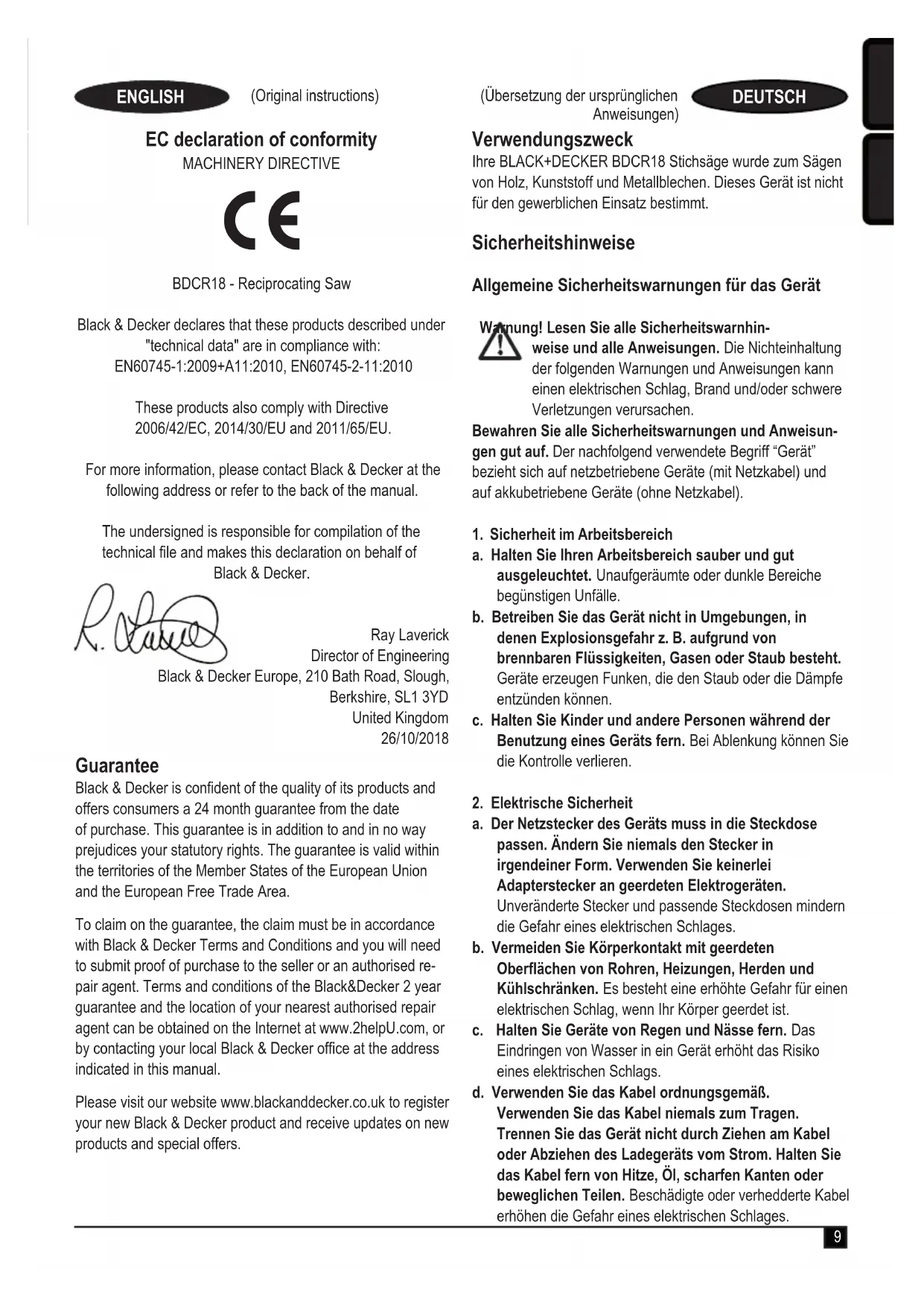 BDCR18 – Stichsäge Black & Decker erklärt, dass die in den technischen Daten beschriebenen Geräte übereinstimmen mit: EN60745-1:2009+A11:2010, EN60745-2-11:2010 Diese Produkte entsprechen außerdem der Richtlinie 2006/42/EG, 2014/30/EU und 2011/65/EU. Weitere Informationen erhalten Sie von Black & Decker unter der folgenden Adresse. Diese bendet sich auch auf der Rückseite dieser Anleitung. Der Unterzeichnete ist verantwortlich für die Zusammenstel- lung der technischen Daten und gibt diese Erklärung im Namen von Black & Decker ab. Ray Laverick Director of Engineering Black & Decker Europe, 210 Bath Road, Slough, Berkshire, SL1 3YD Vereinigtes Königreich 26/10/2018 Garantie Black & Decker vertraut auf die Qualität der eigenen Geräte und bietet dem Käufer eine außergewöhnliche Garantie von 24 Monaten ab Kaufdatum. Diese Garantie versteht sich unbeschadet der gesetzlichen Gewährleistungsansprüche und schränkt diese keinesfalls ein. Diese Garantie gilt innerhalb der Staatsgebiete der Mitgliedstaaten der Europäischen Union und der Europäischen Freihandelszone. Zur Inanspruchnahme dieser Garantie muss sie den allgemeinen Geschäftsbedingungen von Black & Decker entsprechen und dem Verkäufer bzw. der Vertragswerkstatt ist ein Kaufnachweis vorzulegen. Die Bedingungen für die 2-jährige Garantie von Black&Decker und den Standort Ihrer nächstgelegenen Vertragswerkstatt nden Sie im Internet unter www.2helpU.com oder indem Sie sich an die lokale Black&Decker-Niederlassung wenden, deren Adresse Sie in dieser Anleitung nden. Ihr neues Black & Decker Produkt können Sie auf unserer Website unter www.blackanddecker.de registrieren. Dort erhalten Sie auch Informationen über neue Produkte und Sonderangebote. Utilisation prévue Votre scie sauteuse BDCR18 BLACK+DECKER pour scier du bois, du métal et du plastique. Cet outil est exclusivement destiné à un usage domestique. Consignes de sécurité Avertissements de sécurité générale concernant les outils électriques Avertissement ! Lisez tous les avertissements de sécurité et toutes les instructions. Le non-respect des avertissements et des instructions listés ci- dessous peut entraîner des chocs électriques, des incendies et/ou de graves blessures. Conservez tous les avertissements et toutes les instruc- tions an de pouvoir vous y référer dans le futur. Le terme “outil électrique” mentionné dans tous les avertisse- ments listés ci-dessous fait référence à vos outils électriques branchés sur secteur (avec câble) ou fonctionnant sur pile ou batterie (sans l).