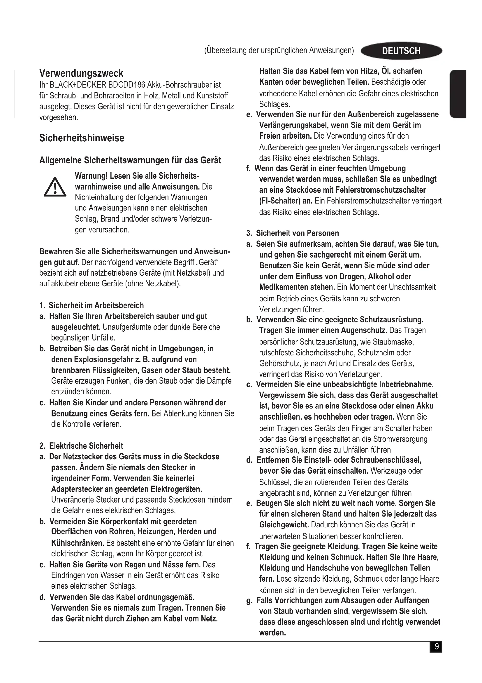 g. Verwenden Sie Gerät, Zubehör, Einsatz-Bits usw. entsprechend diesen Anweisungen, und berücksichtigten Sie darauf die Arbeitsbedingungen und die auszuführende Arbeit. Der Gebrauch von Geräten für andere als die vorgesehenen Zwecke kann zu gefährlichen Situationen führen.