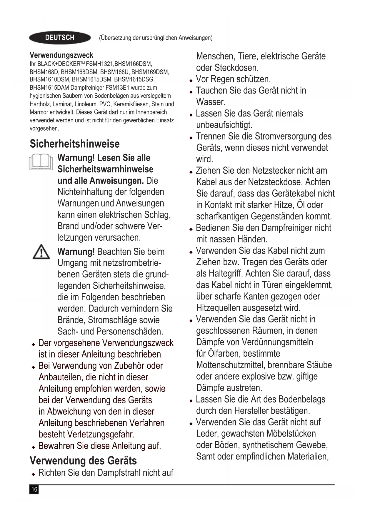FSMH1321,BHSM166DSM, BHSM168D, BHSM168DSM, BHSM168U, BHSM169DSM, BHSM1610DSM, BHSM1615DSM, BHSM1615DSG, BHSM1615DAM Dampfreiniger FSM13E1 wurde zum hygienischen Säubern von Bodenbelägen aus versiegeltem Hartholz,Laminat,Linoleum,PVC,Keramikiesen,Steinund Marmor entwickelt. Dieses Gerät darf nur im Innenbereich verwendet werden und ist nicht für den gewerblichen Einsatz vorgesehen. Sicherheitshinweise Warnung! Lesen Sie alle Sicherheitswarnhinweise und alle Anweisungen. Die Nichteinhaltung der folgenden Warnungen und Anweisungen kann einen elektrischen Schlag, Brand und/oder schwere Ver- letzungen verursachen. Warnung! Beachten Sie beim Umgang mit netzstrombetrie- benen Geräten stets die grund- legenden Sicherheitshinweise, die im Folgenden beschrieben werden. Dadurch verhindern Sie Brände, Stromschläge sowie Sach- und Personenschäden. u Der vorgesehene Verwendungszweck ist in dieser Anleitung beschrieben. u Bei Verwendung von Zubehör oder Anbauteilen, die nicht in dieser Anleitung empfohlen werden, sowie bei der Verwendung des Geräts in Abweichung von den in dieser Anleitung beschriebenen Verfahren besteht Verletzungsgefahr. u Bewahren Sie diese Anleitung auf. Verwendung des Geräts u Richten Sie den Dampfstrahl nicht auf Menschen, Tiere, elektrische Geräte oder Steckdosen. u Vor Regen schützen.u Tauchen Sie das Gerät nicht in Wasser. u Lassen Sie das Gerät niemals unbeaufsichtigt. u Trennen Sie die Stromversorgung des Geräts, wenn dieses nicht verwendet wird. u Ziehen Sie den Netzstecker nicht am Kabel aus der Netzsteckdose. Achten Sie darauf, dass das Gerätekabel nicht in Kontakt mit starker Hitze, Öl oder scharfkantigen Gegenständen kommt. u Bedienen Sie den Dampfreiniger nicht mit nassen Händen. u Verwenden Sie das Kabel nicht zum Ziehen bzw. Tragen des Geräts oder als Haltegriff. Achten Sie darauf, dass das Kabel nicht in Türen eingeklemmt, über scharfe Kanten gezogen oder Hitzequellen ausgesetzt wird. u Verwenden Sie das Gerät nicht in geschlossenen Räumen, in denen Dämpfe von Verdünnungsmitteln für Ölfarben, bestimmte Mottenschutzmittel, brennbare Stäube oder andere explosive bzw. giftige Dämpfe austreten. u Lassen Sie die Art des Bodenbelags durch den Hersteller bestätigen. u Verwenden Sie das Gerät nicht auf Leder, gewachsten Möbelstücken oder Böden, synthetischem Gewebe, SamtoderempndlichenMaterialien,17 (Übersetzung der ursprünglichen Anweisungen) DEUTSCH die durch Dampf beschädigt werden können. Warnung! Verwenden Sie das Gerät nicht auf unversiegelten Holz - und Laminatböden. Der Glanz gewachster und bestimm- terungewachsterOberächen wird möglicherweise durch den heißen Dampf beeinträchtigt. Es wird empfohlen, die Reini- gungswirkung zunächst an einer unauffälligen Stelle zu testen. Beachten Sie auch die Anwei- sungen des jeweiligen Herstel- lerszuGebrauchundPege des Bodenbelags. u Befüllen Sie den Dampfreiniger nicht mit Entkalker, alkoholhaltigen Stoffen sowie Duft- oder Reinigungsmitteln, da das Gerät hierdurch beschädigt oder die Gerätesicherheit beeinträchtigt werden kann. u Stellen Sie die Verwendung des Geräts unmittelbar ein, und wenden Sie sich an den Kundendienst, wenn der Schutzschalter bei Verwendung der Dampffunktion ausgelöst wird. (Es besteht die Gefahr eines Stromschlags.) u Das Gerät erzeugt zur hygienischen SäuberungderAnwendungsoberäche Dampf mit sehr hoher Austrittstemperatur. Deshalb können Reinigungskopf, Bodentuch und Teppichaufsatz bei Betrieb des Geräts sehr heiß werden. Achtung! Tragen Sie bei der Verwendung des Dampfreinigers und dem Austausch der Zubehörteile zweckmäßiges Schuhwerk. Tragen Sie keine Hausschuhe oder Sandalen. u Der Gerätedeckel kann während des Betriebs heiß werden. u Bei Verwendung des Geräts kann Dampf austreten. Das Gerät ist mit Vorsicht zu betreiben. Teile, die während des Betriebs heiß werden können, dürfen NICHT BERÜHRT WERDEN. u Schalten Sie das Gerät aus, und bewegen Sie den Griff in die aufrechte Stellung, bevor Sie den Wassertank entfernen. u Schalten Sie das Gerät aus, trennen Sie es von der Stromversorgung, und lassen Sie das Gerät abkühlen, wenn Dampf aus dem Gehäuse des Handdampfreinigers austritt. Wenden Sie sich an eine Vertragswerkstatt in Ihrer Nähe. Das Gerät darf nicht weiter verwendet werden. Nach dem Gebrauch u Ziehen Sie den Netzstecker und lassen Sie das Gerät vor dem Reinigen abkühlen. u Bewahren Sie das Gerät bei NichtgebrauchaneinemtrockenenOrt auf. u Kinder sollten keinen Zugang zu aufbewahrten Geräten haben. Inspektion und Reparaturen u Ziehen Sie vor der Durchführung von Wartungsarbeiten oder Reparaturen18 (Übersetzung der ursprünglichen Anweisungen) DEUTSCH den Netzstecker und lassen Sie das Gerät abkühlen. u Prüfen Sie das Gerät vor der Verwendung auf beschädigte oder defekte Teile. Prüfen Sie, ob Teile gebrochen sind, Schalter beschädigt sind oder andere Bedingungen vorliegen, welche die Funktion beeinträchtigen könnten. u Überprüfen Sie das Netzkabel in regelmäßigen Abständen auf Beschädigungen. u Betreiben Sie das Gerät nicht, wenn ein Teil beschädigt oder defekt ist. u Lassen Sie beschädigte oder defekte Teile in einer Vertragswerkstatt reparieren oder austauschen. u Ersetzen oder entfernen Sie keine Teile, für die in dieser Anleitung keine entsprechende Beschreibung enthalten ist. Sicherheit anderer Personen u Dieses Gerät darf von Personen mit eingeschränkten körperlichen, sensorischen oder geistigen Fähigkeiten sowie mangelnder Erfahrung und Wissen in Bezug auf dessen Gebrauch bedient werden, wenn sie bei der Verwendung des Geräts beaufsichtigt oder angeleitet werden und die möglichen Gefahren verstehen. Kinder dürfen nicht mit dem Gerät spielen. u Kinder müssen beaufsichtigt werden, um sicherzustellen, dass sie nicht mit dem Gerät spielen. u Der Stecker muss vor der Reinigung oder Wartung des Geräts aus der Steckdose gezogen werden. u Halten Sie Flüssigkeiten oder Dampf von G