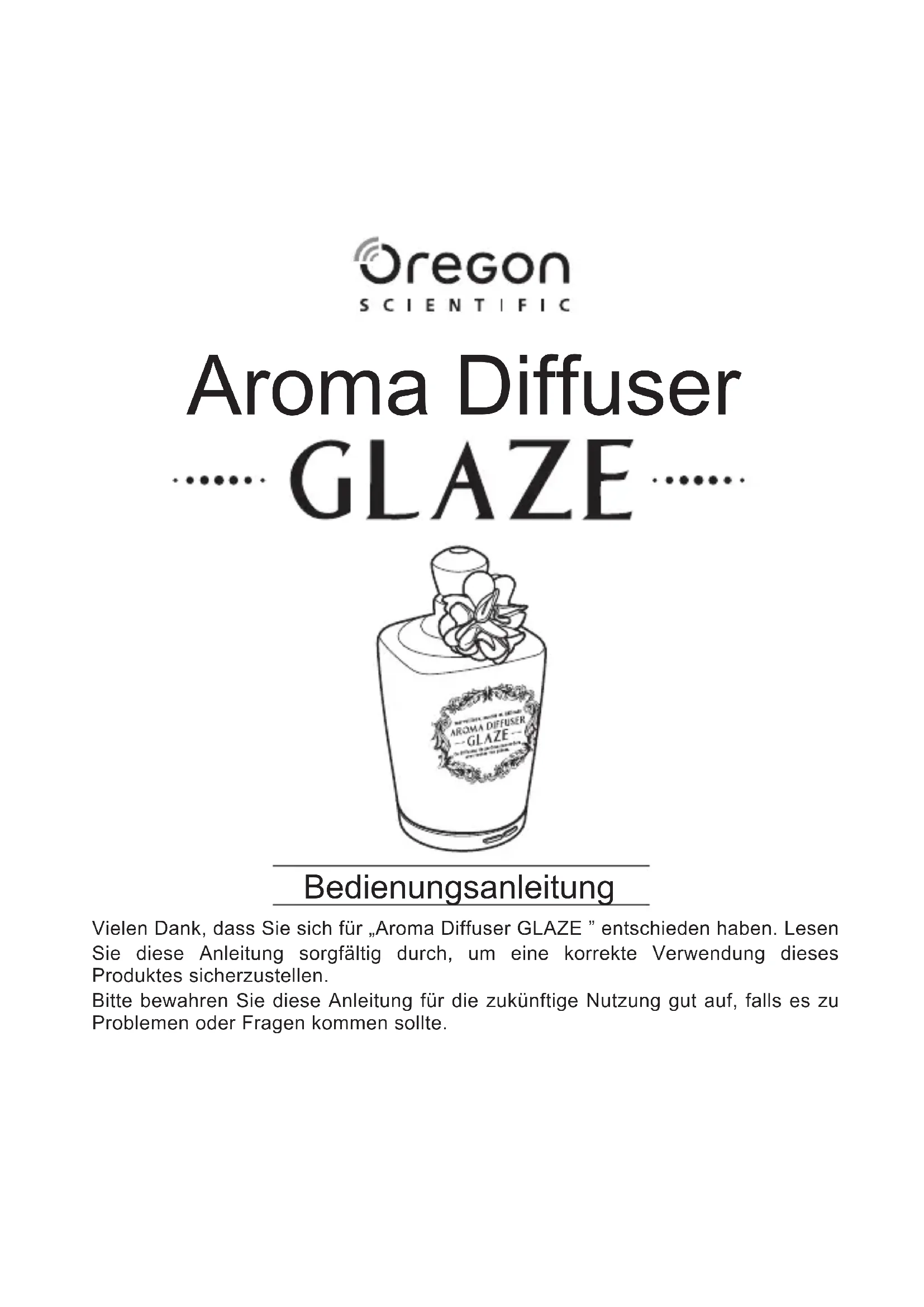 Product Specification There is individual difference of dimension and weight. The product specification and design may change without prior notice.EU Declaration of Conformity Disposal Information for Users Hereby the manufacturer, Oregon Scientific, declares that the equipment type: Aroma diffuser GLAZE (HWI0006) is in compliance with 2014/30/EU Directive. The full text of the EU Declaration of Conformity is available at the following internet address: www.oregonscientific.com Pursuant to and in accordance with Article 14 of the Directive 2012/19/EU of the European Parliament on waste electrical and electronic equipment (WEEE), and pursuant to and in accordance with Article 20 of the Directive 2013/56/EU of the European Parliament on batteries and accumulators and waste batteries. The barred symbol of the rubbish bin shown on the equipment indicates that, at the end of its useful life, the product must be collected separately from other waste. Please note that the batteries/rechargeable batteries must be removed from the equipment before it is given as waste. To remove the batteries/accumulators refer to the specifications in the user manual. Therefore, any products that have reached the end of their useful life must be given to waste disposal centers specializing in separate collection of waste electrical and electronic equipment, or given back to the dealer when purchasing a new WEEE, pursuant to and in accordance with Article 14 as implemented in the country. The adequate separate collection for the subsequent start-up of the equipment sent to be recycled, treated and disposal of in an environmentally compatible way contributes to prevent- ing possible negative effects on the environment and health and optimizes the recycling and reuse of components making up the apparatus. Abusive disposal of the product by the user involves application of the administrative sanctions according to the laws in force. 16Bedienungsanleitung Aroma Diffuser Vielen Dank, dass Sie sich für „Aroma Diffuser GLAZE ” entschieden haben. Lesen Sie diese Anleitung sorgfältig durch, um eine korrekte Verwendung dieses Produktes sicherzustellen. Bitte bewahren Sie diese Anleitung für die zukünftige Nutzung gut auf, falls es zu Problemen oder Fragen kommen sollte.2 Vorsichtsmaßnahmen (Bitte sorgfältig durchlesen) ● Um Verletzungen der Benutzer und anderer Personen oder Schäden zu vermeiden, müssen die folgenden Anweisungen befolgt werden. Lesen Sie die Vorsichtsmaßnahmen sorgfältig durch, um eine korrekte Verwendung sicherzustellen. Warnung Das Symbol kennzeichnet Vorsichtsmaßnahmen, die bei falscher Ausführung zum Tod oder ernsthaften Verletzungen” führen können Vorsicht Das Symbol kennzeichnet Vorsichtsmaßnahmen, die bei falscher Ausführung zu leichten Verletzungen oder Schäden führen können. ● Die folgenden Symbole unterscheiden zwischen Inhalte, die vermieden oder befolgt werden müssen. Kennzeichnet, Verbot „was nicht getan werden darf” Kennzeichnet Anweisung, „was getan werden muss”. Warnung Berühren Sie nicht die Ultraschall-Vibrationsplatte, während das Produkt sich in Betrieb befindet. Dies könnte zu Verbrennungen führen.Halten Sie das Gerät außerhalb der Reichweite von Kindern und entsorgen Sie die Plastikverpackung, um zu vermeiden, dass Kinder daran ersticken.Dieses Produkt darf nicht modifiziert, repariert oder umgebaut werden. Dies könnte zu Feuer oder Stromschlag führen. Verwenden Sie das Produkt nur, wie es in dieser Anleitung beschrieben ist. Ansonsten könnte es zu Verletzungen oder Versagen kommen.Treten Sie nicht auf dieses Produkt, lassen Sie es nicht fallen und schlagen Sie es nicht. Schäden am Produkt könnte zu Feuer oder Stromschlag führen. Stoppen Sie die Stromversorgung, wenn Sie irgendwelche Schäden bemerken. Ansonsten könnte es zu Feuer und Stromschlag kommen.Berühren Sie den Hauptkörper des Produkts, den Stecker und den USB-Stecker nicht mit nassen Händen. Dies könnte zu Versagen, Feuer oder Stromschlag führen.Lassen Sie weder den Hauptkörper noch das Zubehör nass werden. Benutzern und lagern Sie das Produkt nicht in einer feuchten Umgebung, wie z.B. ein Badezimmer, Wechselzimmer und ein Gartenhaus. Dies könnte zu Versagen, Feuer oder Stromschlag führen. Wenn Wasser ausläuft, schalten Sie das Gerät aus, unterbrechen Sie die Verwendung des Produktes. Dies könnte zu Feuer oder Stromschlag führen.3 Warnung Vorsicht Platzieren Sie das Produkt außerhalb der Reichweite von Kleinkindern. Es könnte zu Verletzungen kommen, wenn der Hauptkörper zusammenfällt oder das Gerät falsch verwendet wird. Atmen Sie den Dampf, der direkt aus dem Dampfauslass kommt, nicht absichtlich ein. Dies könnte gesundheitsschädlich sein. Dieses Produkt ist kein medizinisches Atemgerät. Benutzen Sie dieses Produkt nur für die Verteilung von Aromadüften. Verwenden Sie zur Reinigung des Hauptkörpers nur Küchenreinigungsmittel. Wenn Reinigungsmittel im Wassertank zurückbleibt, könnten diese zu giftigen Gasen oder Versagen führen. Ziehen Sie vor der Reinigung den USB-Stecker (aus dem USB-Port des Computers) ab, um Stromschlag oder Verletzungen zu vermeiden. Nicht in das Gerät stechen oder scharfe, metallische Gegenstände, wie z.B. eine Nadel oder eine Stecknadel hineinstecken. Dies könnte zu Verletzungen oder Stromschlag führen. Dampfauslass, Lufteinlass und Luftauslass nicht blockieren. Eine Störung der normalen Funktionsweise könnte zu Fehlfunktion, Überhitzung oder Versagen führen. Berühren Sie gleich nach der Benutzung nicht den Hauptkörper. Denken Sie an die hohe Temperatur des Dampfes oder Wassers im Wassertank. Es könnte zu Verbrennungen kommen. Entfernen Sie nicht die Keramikabdeckung oder den Deckel des Wassertanks, während das Produkt in Betrieb ist. Wasser und ätherisches Öl könnte auslaufen, naheliegende Gegenstände beschädigen und zu Versagen führen. Tauschen Sie das Wasser im Wassertank täglich aus und stellen Sie si