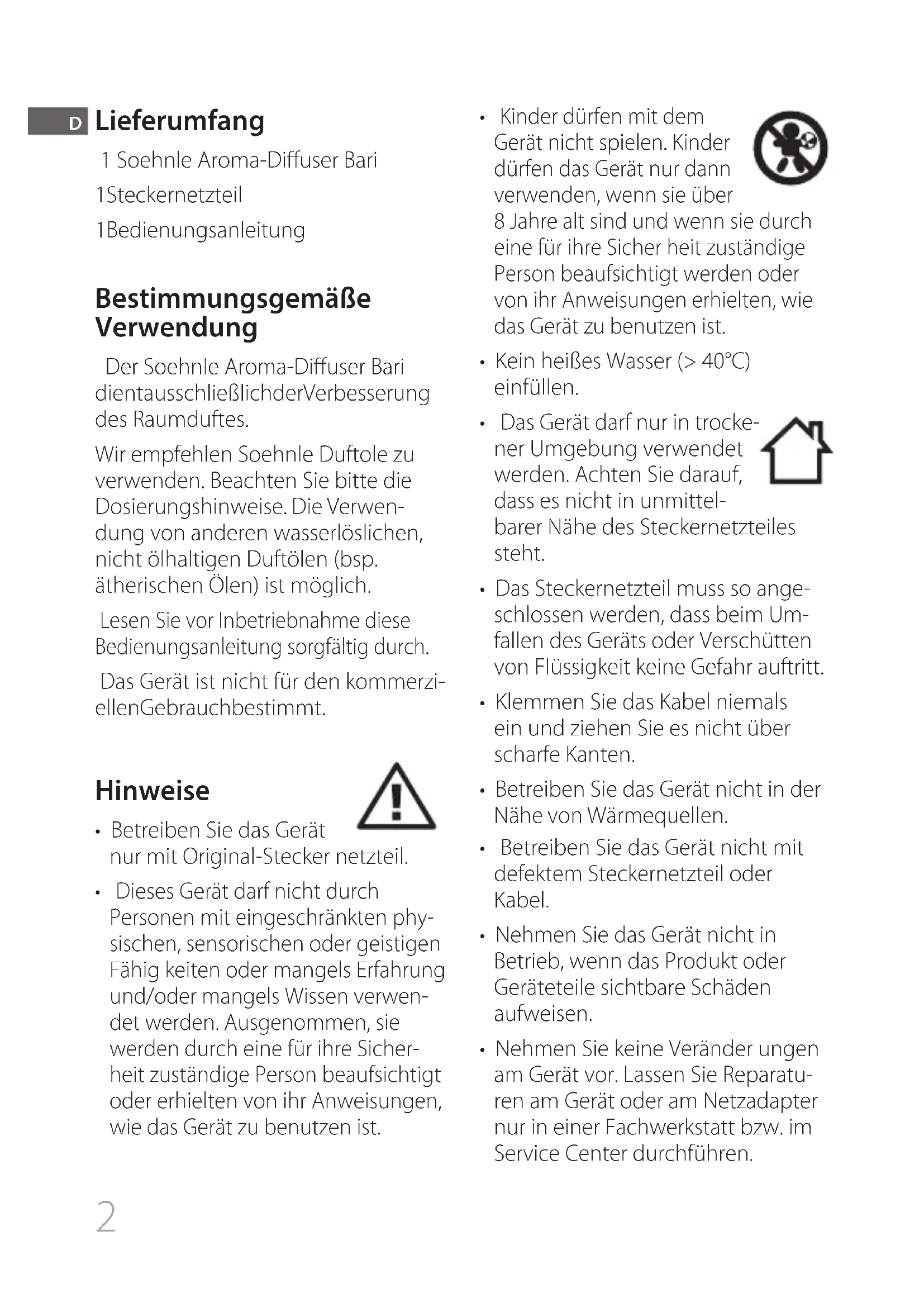 1-2 drops max. 80 ml2 Lieferumfang 1 Soehnle Aroma-Diffuser Bari 1 Stecker netzteil 1 Be die nungs anleitung Bestimmungsgemäße Verwendung Der Soehnle Aroma-Diffuser Bari dient ausschließlich der Ver bes serung des Raumduftes. Wir empfehlen Soehnle Duftole zu verwenden. Beachten Sie bitte die Dosierungshinweise. Die Verwen- dung von anderen wasserlöslichen, nicht ölhaltigen Duftölen (bsp. ätherischen Ölen) ist möglich. Lesen Sie vor Inbetriebnahme diese Bedienungsanleitung sorgfältig durch. Das Gerät ist nicht für den kommerzi- ellen Gebrauch be stimmt. Hinweise