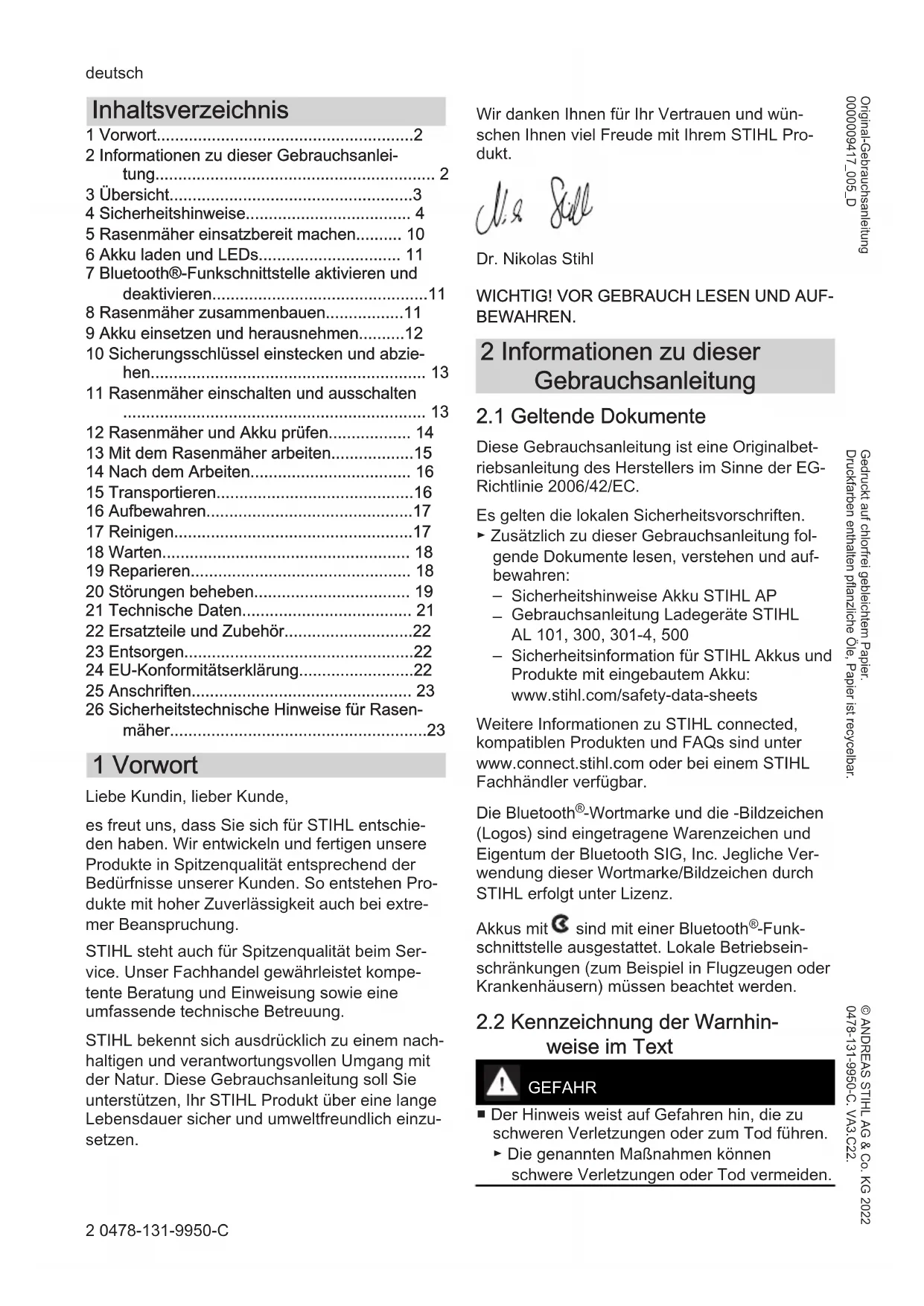 - 26 Sicherheitstechnische Hinweise für Rasen‐ mäher 1 Vorwort Liebe Kundin, lieber Kunde, es freut uns, dass Sie sich für STIHL entschie‐ den haben. Wir entwickeln und fertigen unsere Produkte in Spitzenqualität entsprechend der Bedürfnisse unserer Kunden. So entstehen Pro‐ dukte mit hoher Zuverlässigkeit auch bei extre‐ mer Beanspruchung. STIHL steht auch für Spitzenqualität beim Ser‐ vice. Unser Fachhandel gewährleistet kompe‐ tente Beratung und Einweisung sowie eine umfassende technische Betreuung. STIHL bekennt sich ausdrücklich zu einem nach‐ haltigen und verantwortungsvollen Umgang mit der Natur. Diese Gebrauchsanleitung soll Sie unterstützen, Ihr STIHL Produkt über eine lange Lebensdauer sicher und umweltfreundlich einzu‐ setzen. Wir danken Ihnen für Ihr Vertrauen und wün‐ schen Ihnen viel Freude mit Ihrem STIHL Pro‐ dukt. Dr. Nikolas Stihl p. 23