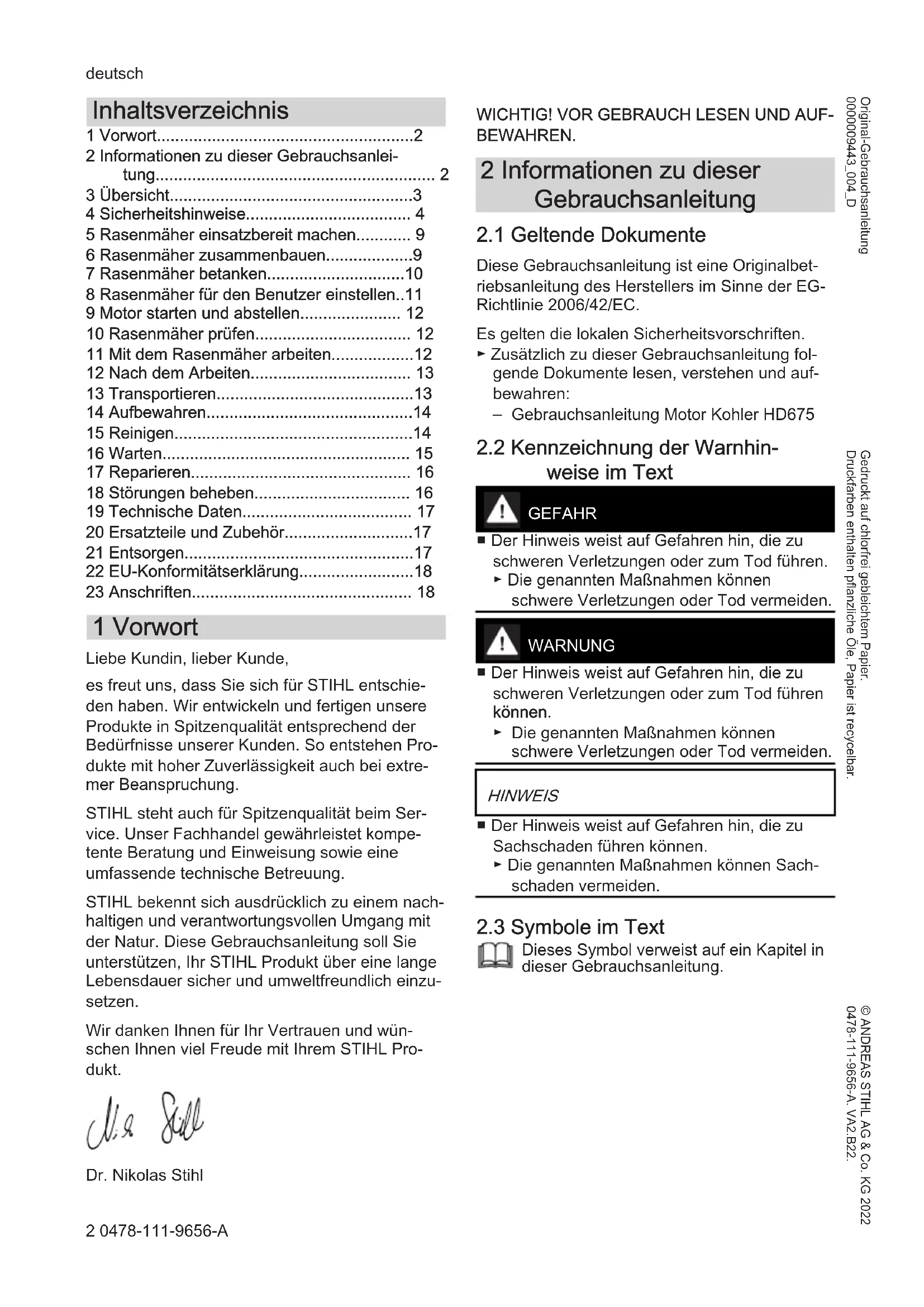Dieses Symbol verweist auf ein Kapitel in dieser Gebrauchsanleitung. deutsch 2 0478-111-9656-A © ANDREAS STIHL AG & Co. KG 2022 0478-111-9656-A. VA2.B22. Gedruckt auf chlorfrei gebleichtem Papier. Druckfarben enthalten pflanzliche Öle, Papier ist recycelbar. Original-Gebrauchsanleitung 0000009443_004_D3 Übersicht