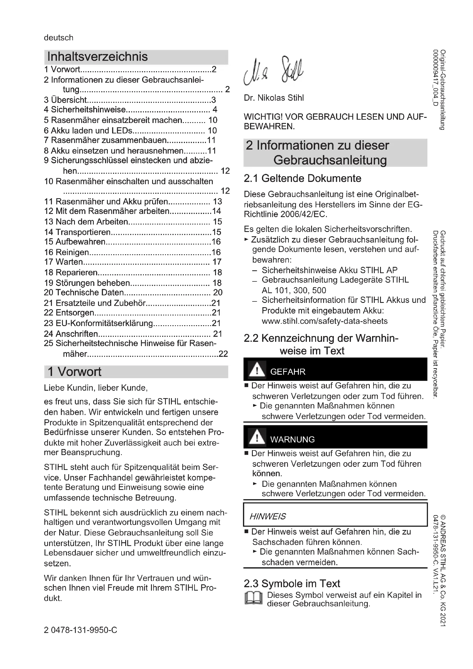 - 25 Sicherheitstechnische Hinweise für Rasen‐ mäher 1 Vorwort Liebe Kundin, lieber Kunde, es freut uns, dass Sie sich für STIHL entschie‐ den haben. Wir entwickeln und fertigen unsere Produkte in Spitzenqualität entsprechend der Bedürfnisse unserer Kunden. So entstehen Pro‐ dukte mit hoher Zuverlässigkeit auch bei extre‐ mer Beanspruchung. STIHL steht auch für Spitzenqualität beim Ser‐ vice. Unser Fachhandel gewährleistet kompe‐ tente Beratung und Einweisung sowie eine umfassende technische Betreuung. STIHL bekennt sich ausdrücklich zu einem nach‐ haltigen und verantwortungsvollen Umgang mit der Natur. Diese Gebrauchsanleitung soll Sie unterstützen, Ihr STIHL Produkt über eine lange Lebensdauer sicher und umweltfreundlich einzu‐ setzen. Wir danken Ihnen für Ihr Vertrauen und wün‐ schen Ihnen viel Freude mit Ihrem STIHL Pro‐ dukt. Dr. Nikolas Stihl p. 22