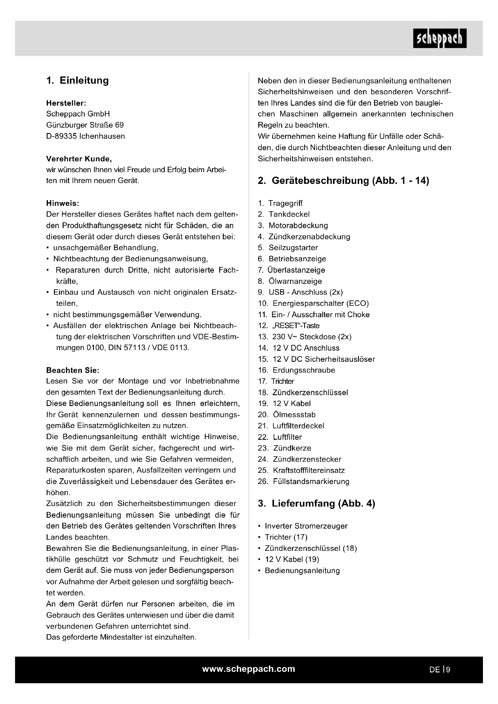 Der Stromerzeuger ist für Geräte, die einen Betrieb an einer 230 V Wechselspannungs- oder 12V Gleichspan- nungsquelle vorsehen, geeignet. Bei Haushaltsgeräten und elektronischen Geräten prü- fen Sie bitte die Eignung nach den jeweiligen Herstel- lerangaben. Achtung! Der Stromerzeuger darf nicht, als Haus- Notstrom-Versorgung an das Hausnetz angeschlos- sen werden. Es können dadurch Beschädigungen am Stromerzeuger oder an anderen Elektrogeräten verur- sacht werden. Die Maschine darf nur nach ihrer Bestimmung ver- wendet werden. Jede weitere darüber hinausgehende Verwendung ist nicht bestimmungsgemäß. Für daraus hervorgerufene Schäden oder Verletzungen aller Art haftet der Benutzer/Bediener und nicht der Hersteller. Bestandteil der bestimmungsgemäßen Verwendung ist auch die Beachtung der Sicherheitshinweise, sowie die Montageanleitung und Betriebshinweise in der Bedie- nungsanleitung. Personen, welche die Maschine bedienen und warten, müssen mit dieser vertraut und über mögliche Gefah- ren unterrichtet sein. Darüber hinaus sind die geltenden Unfallverhütungs- vorschriften genauestens einzuhalten. Sonstige allgemeine Regeln in arbeitsmedizinischen und sicherheitstechnischen Bereichen sind zu beach- ten. Veränderungen an der Maschine schließen eine Haf- tung des Herstellers und daraus entstehende Schäden gänzlich aus. Bitte beachten Sie, dass unsere Geräte bestimmungs- gemäß nicht für den gewerblichen, handwerklichen oder industriellen Einsatz konstruiert wurden. Wir übernehmen keine Gewährleistung, wenn das Gerät in Gewerbe-, Handwerks- oder Industriebetrieben sowie bei gleichzusetzenden Tätigkeiten eingesetzt wird.www.scheppach.com