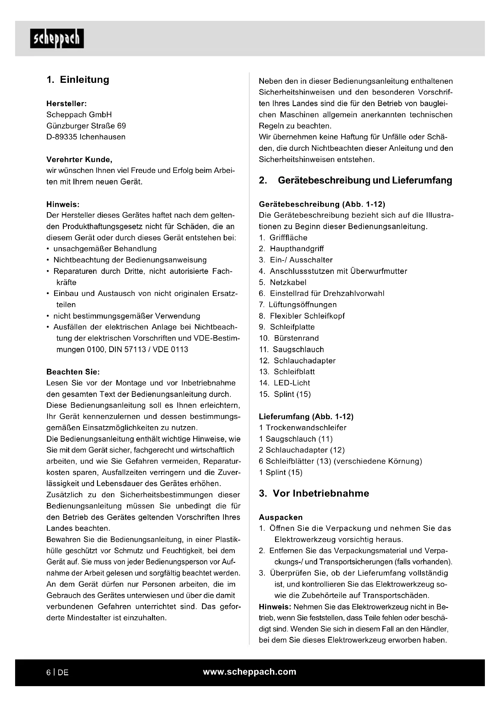 Hersteller: Scheppach GmbH Günzburger Straße 69 D-89335 Ichenhausen Verehrter Kunde, wir wünschen Ihnen viel Freude und Erfolg beim Arbei- ten mit Ihrem neuen Gerät. Hinweis: Der Hersteller dieses Gerätes haftet nach dem gelten- den Produkthaftungsgesetz nicht für Schäden, die an diesem Gerät oder durch dieses Gerät entstehen bei: